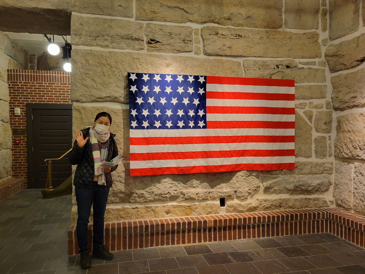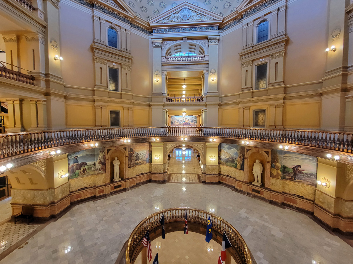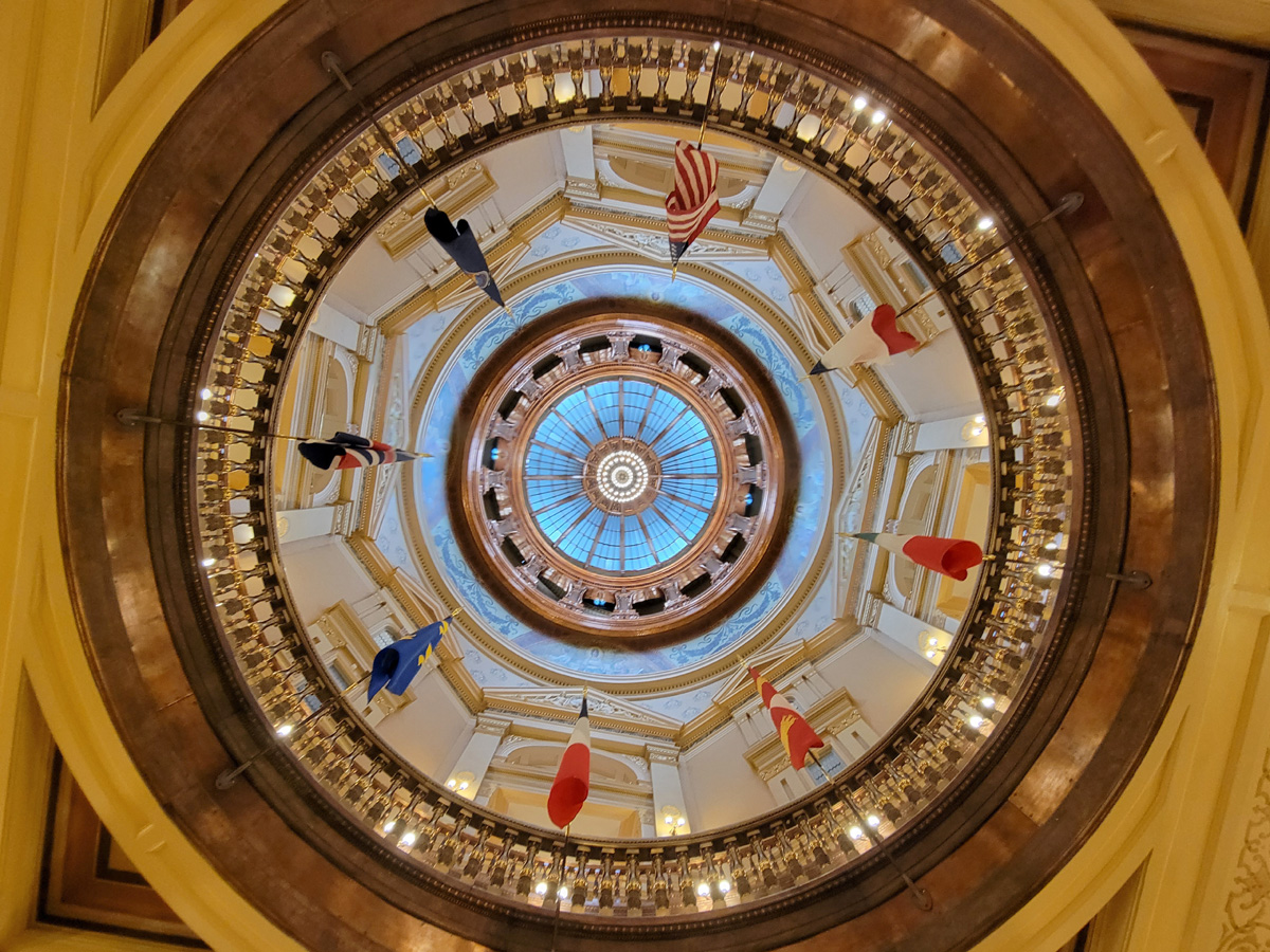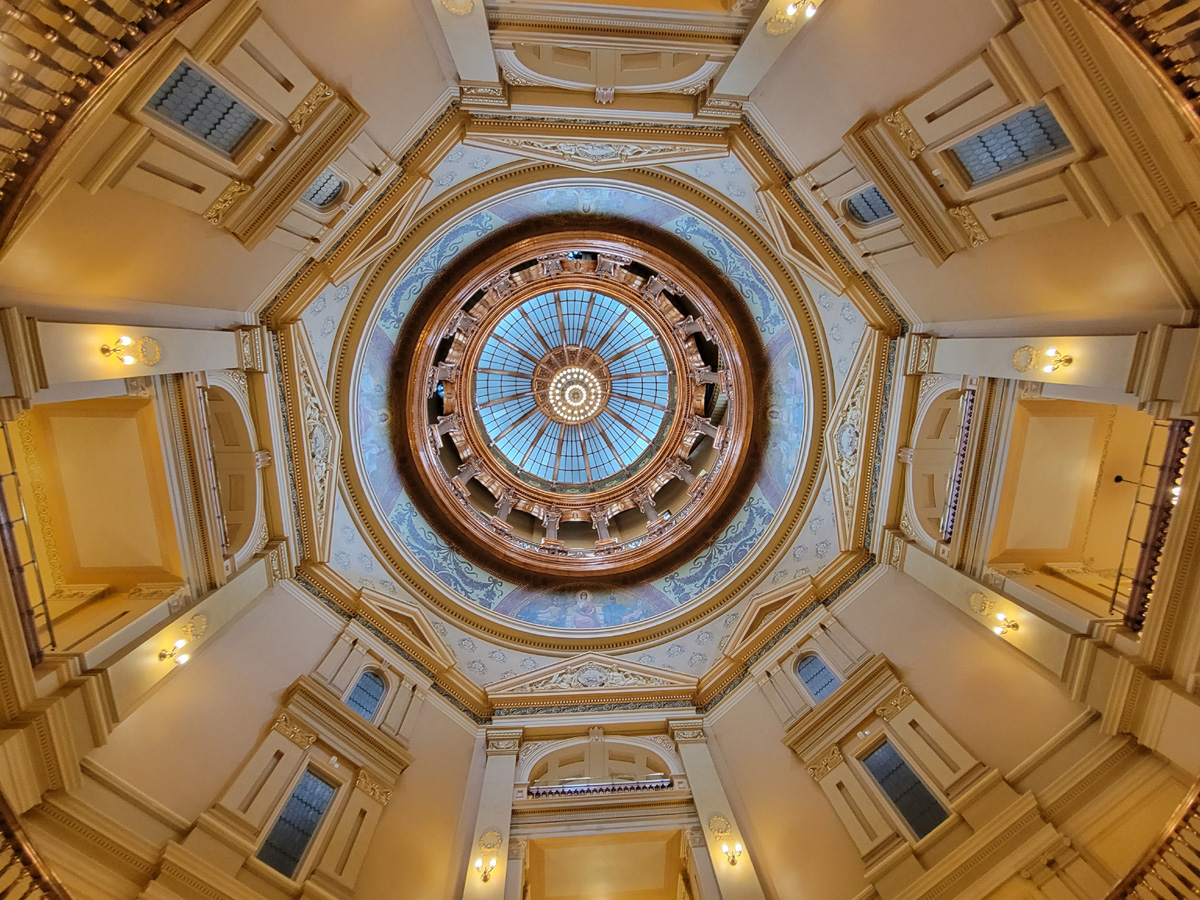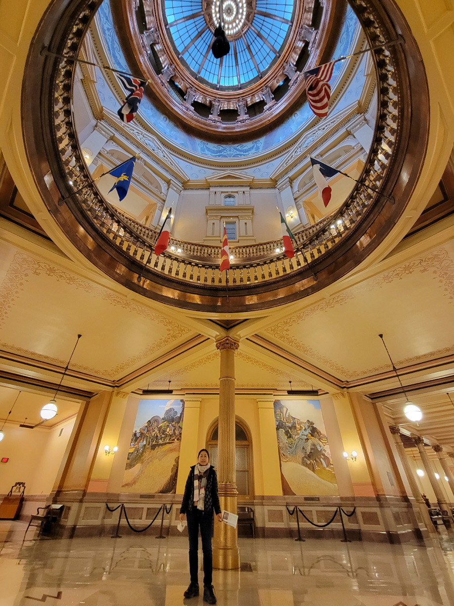 비지터센터가 있는 주청사(State Capitol) 건물의 1층 중앙홀에 선 아내인데, 머리 위로 돔지붕의 끝까지 보이는 모습이 멋있었다.