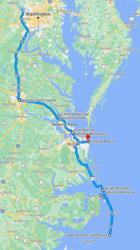 가끔 줄여서 '노바(NoVA)'라고 부르는 워싱턴DC 인근의 북부 버지니아(Northern Virginia)로 작년에 이사를 와서는, 계속 뉴욕과 보스턴이 있는 북쪽으로만 차를 몰고 올라갔었기 때문에, 그래서 9월에는 하루 휴가를 내서 처음으로 집에서 남쪽으로 자동차여행을 가보기로 여름부터 마음을 먹고 있었다. 최초 계획은 집에서 약 500마일 남쪽에 있는 미지의 국립공원과 그 아래 미국남부의 문화를 대표하는 도시인 사우스캐롤라이나(South Carolina) 주의 찰스턴(Charleston)을 2박3일로 여행하려고 했었다. 하지만 아무래도 제대로 구경을 하기에는 일정이 너무 빠듯한 것 같아서, 그냥 남부 버지니아의 역사 유적지들과 그 아래 노스캐롤라이나의 유명한 바닷가를 1박2일에 둘러보는 것으로 계획이 축소되었다.