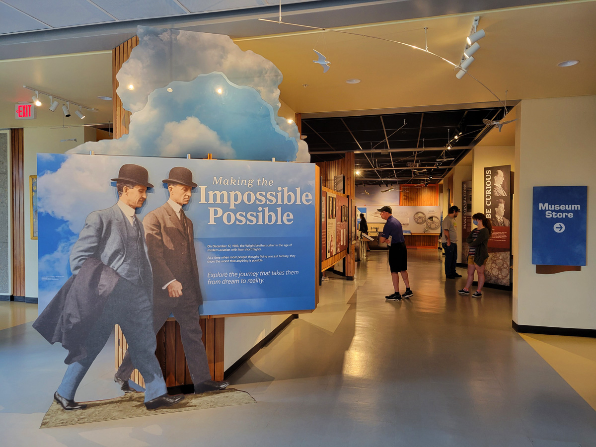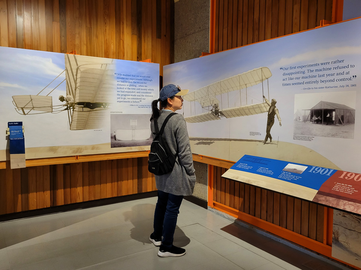 세계최초 동력 비행기의 실물모형이 그 발전과정과 함께 전시되어 있는데, 클릭해서 동영상으로 전시내용과 함께 간단히 보실 수 있다. (다음 해 1904년부터는 고향인 오하이오에서 비행기 테스트를 계속했다고 하며, 연구실로 사용한 자전거 공장과 비행연습을 한 들판 등이 역시 국립공원청이 직접 관리하는 역사공원인 Dayton Aviation Heritage National Historical Park로 지정되어 있음)