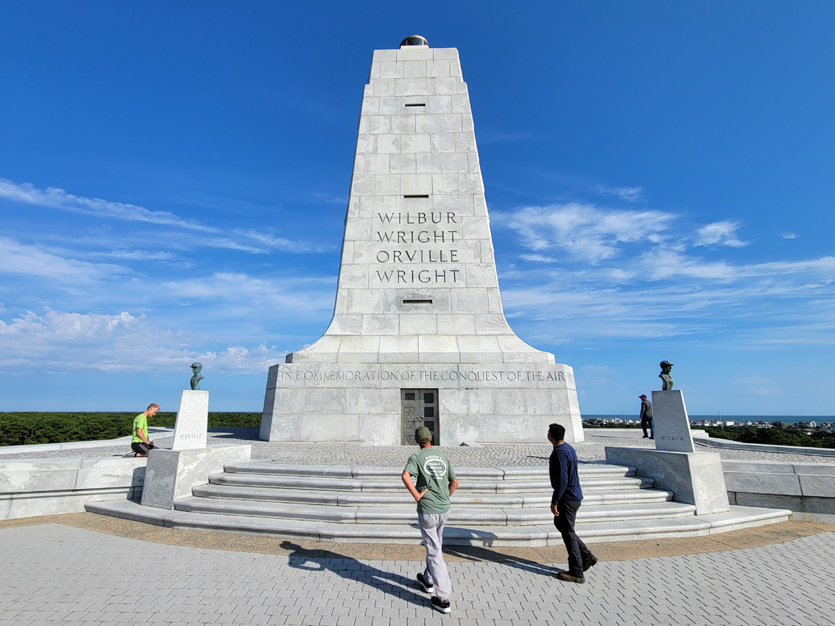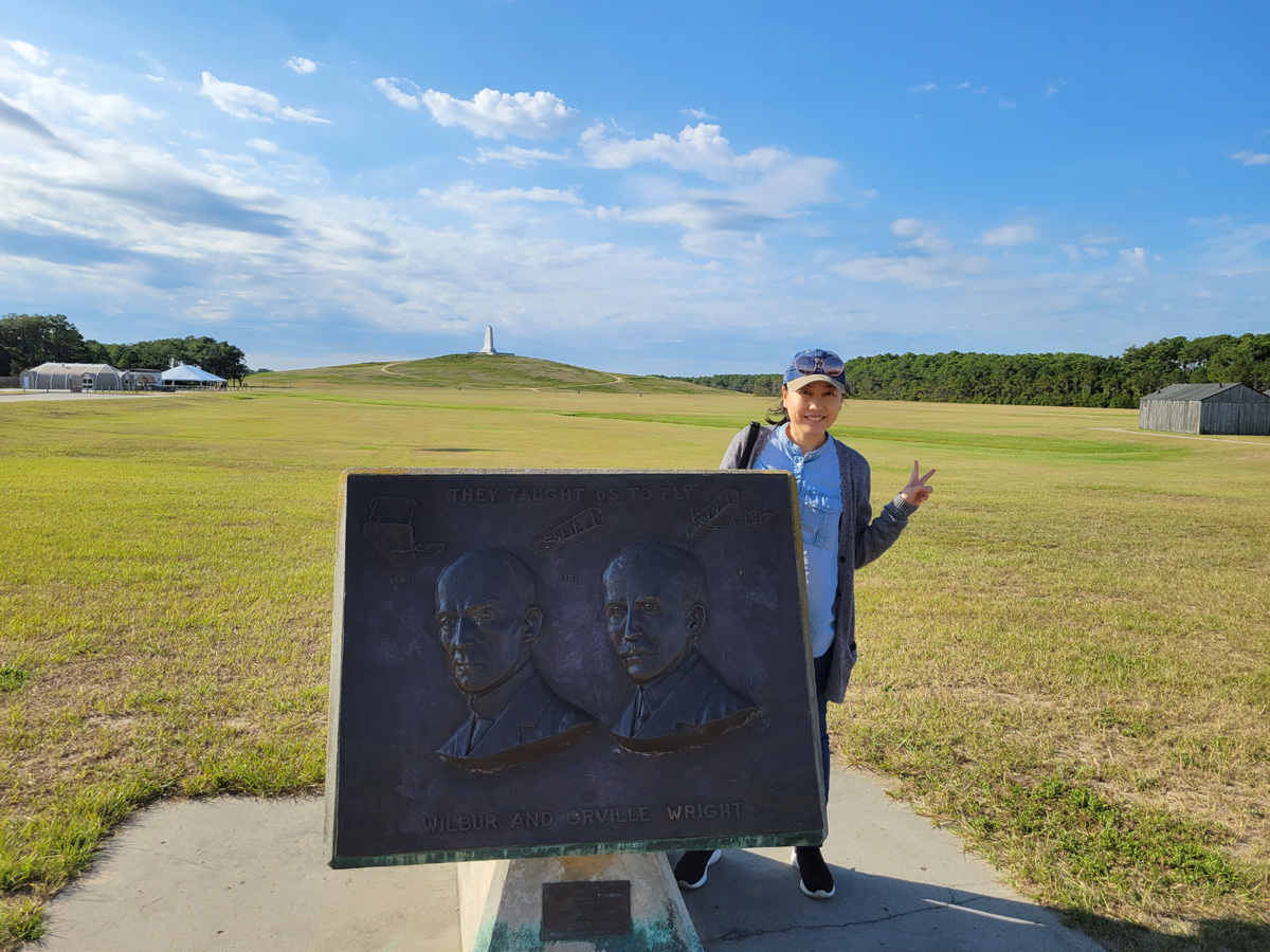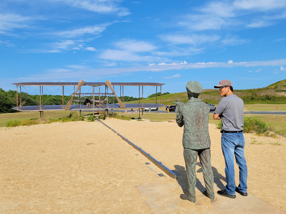 여기 미국 노스캐롤라이나 키티호크 마을의 한적한 바닷가 모래사장에서 처음 날아오른 저 라이트플라이어(Wright Flyer)에서, 지금 우리가 타고 다니는 여객기와 음속보다 훨씬 빠른 제트기는 물론이고, 우주왕복선과 로켓까지 인류의 모든 비행의 역사가 시작되었다. 그것을 기리기 위해서 1969년에 아폴로 우주선이 라이트 형제가 사용했던 천과 나무조각을 싣고 달에 착륙했으며, 작년 2021년에 화성에서 비행에 성공한 헬리콥터 '인제뉴이티(Ingenuity)'도 라이트플라이어의 날개 천조각을 품고 날았고, 지구밖에서 인류가 최초로 동력비행에 성공했던 그 붉은 땅을 Wright Brothers Field라고 명명했다는 뉴스가 있었다.