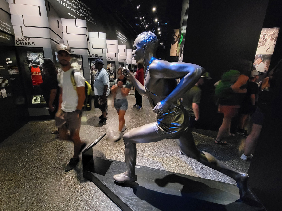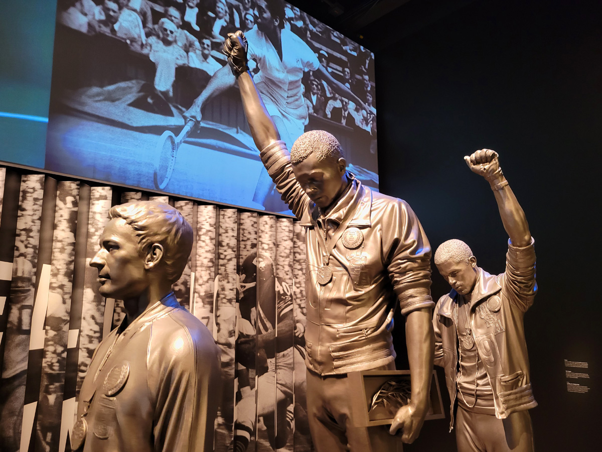 3층 커뮤니티갤러리(Community Galleries)의 스포츠 전시실 입구에는 이 박물관에서 가장 유명한 동상들 중의 하나로, 1968년 멕시코시티 올림픽의 남자 200미터 시상식에서 금메달과 동메달을 딴 흑인선수가 미국 국가가 울려퍼지며 성조기가 올라가는 동안에 검은 장갑을 낀 주먹을 들고 고개를 숙인 모습이 만들어져 있다. 그 해 4월 4일에 암살당했던 마틴 루터 킹 목사에 대한 추모와 미국내 인종차별에 항의하는 이 'Black Power Salute'로 그들은 선수촌에서 쫒겨나고 메달 박탈까지 검토되었다고 한다.