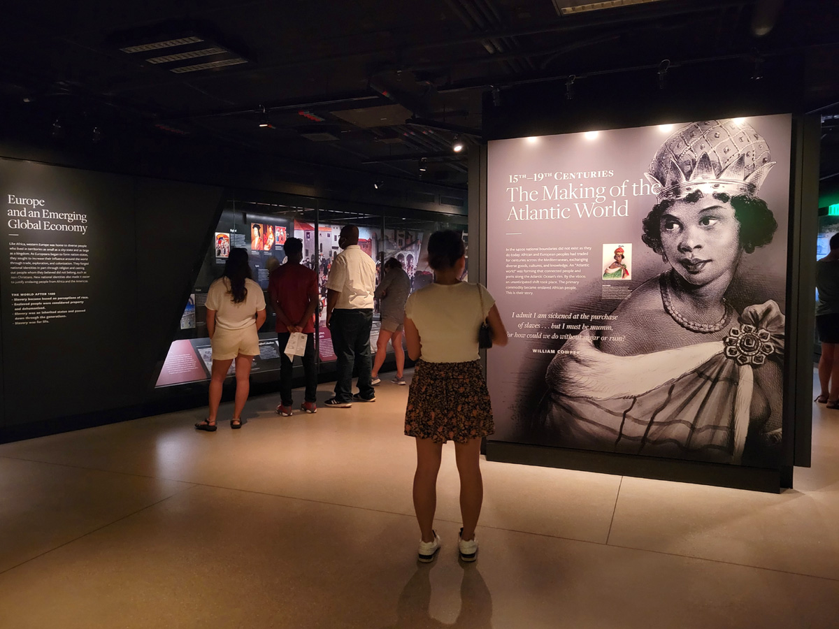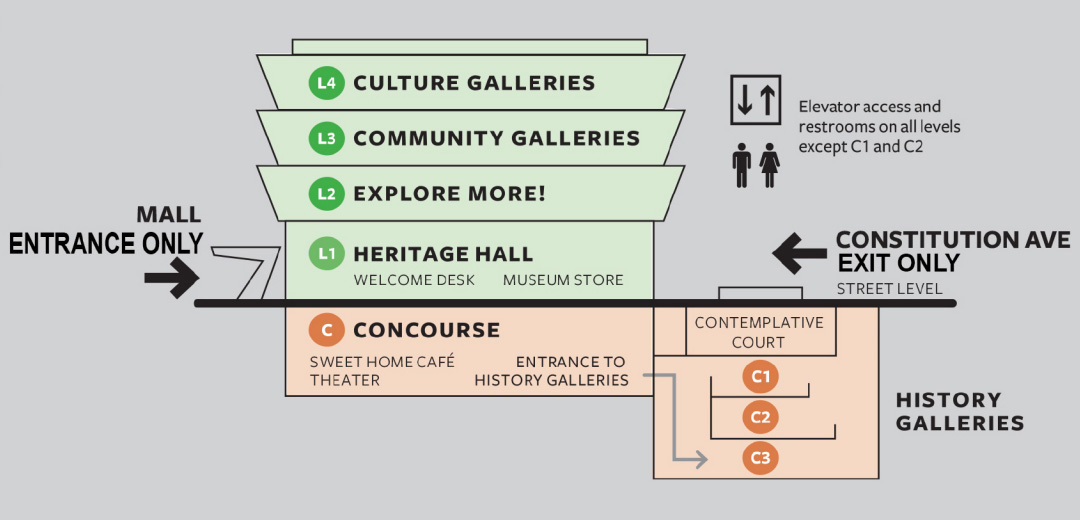단면도에 중앙홀(Concourse)이라 되어있는 지하로 에스컬레이터를 타고 내려오면 왼쪽에는 특별전시실이 있고 오른쪽으로 15세기부터 현재까지 미국 흑인들의 역사를 보여주는 전시실의 입구가 나온다.