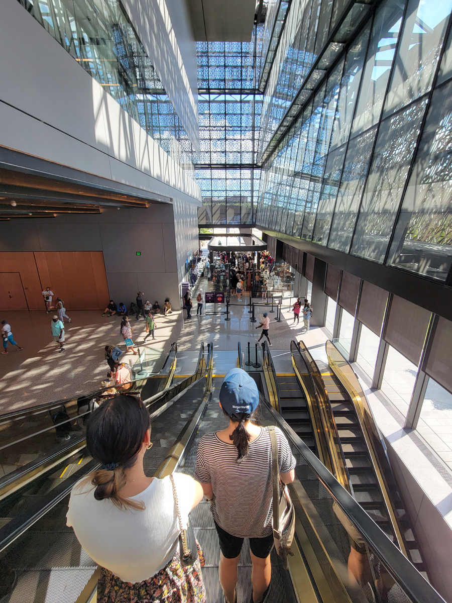 창가를 따라 에스컬레이터를 타고 올라가면서, 유리벽을 가린 '망(scrim)'을 통해 빛이 들어오는 것이 한국의 창호지에 격자무늬를 붙인 느낌이었다. 저 문양은 아프리카에서 유래해 남부 흑인들이 사용하는 것이고, 원래는 저 창살을 순수한 청동(bronze)으로 만들 계획이었단다. 하지만 가격이 너무 높아서 코팅방식 등을 검토한 끝에, 결국은 특별한 염료를 섞어서 구릿빛을 내는 PVDF(polyvinyl difluoride)라는 합성수지로 만들어졌다는 것이 의외였다.