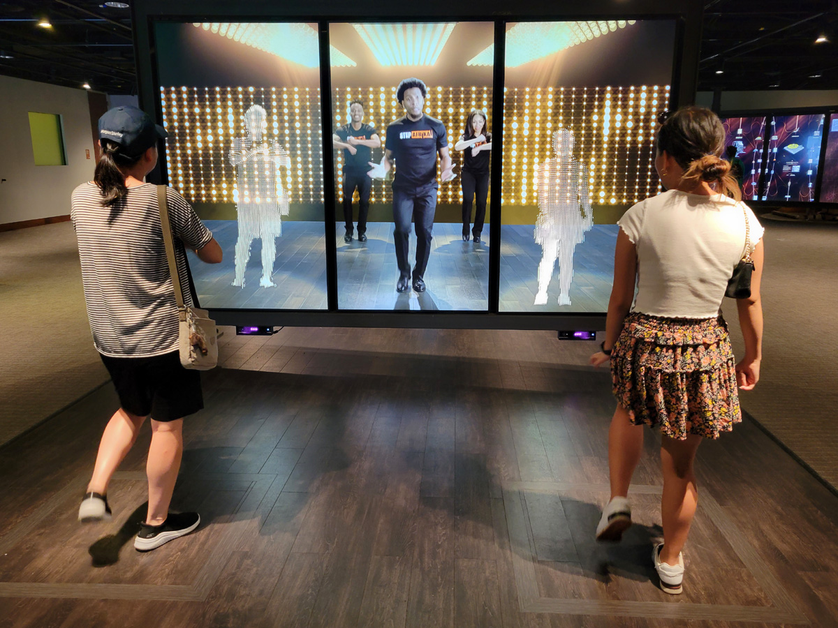 특히 흑인들의 댄스를 배우는 이 시설은 대형화면과 동작센서를 결합해서, 지금 바닥 좌우의 사각형 안에 서있는 아내와 지혜의 움직임이 화면에 하얀 점으로 실시간으로 표시되는 최첨단의 장치였다.