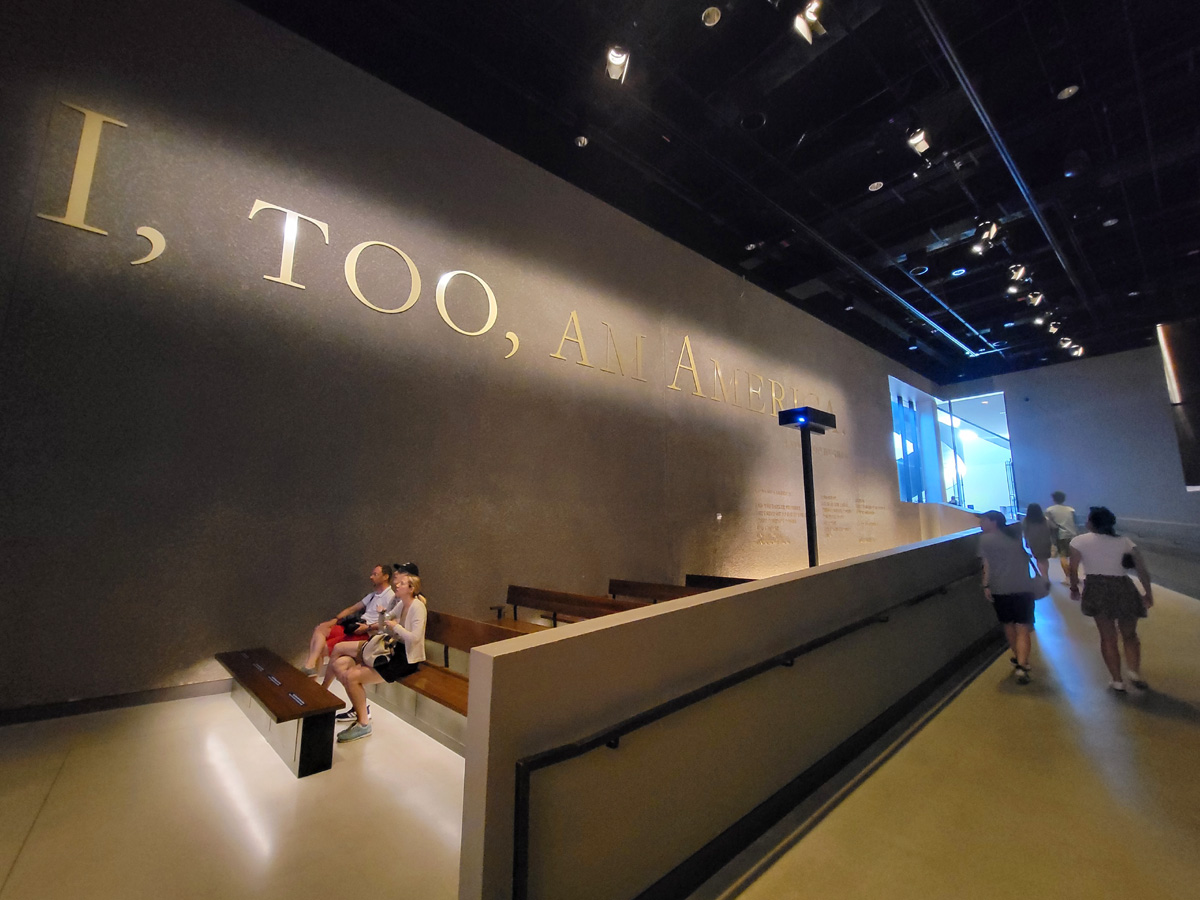 역사 전시실을 나가는 마지막 경사로 옆에는 "I, too, am America."라는 흑인 시인 Langston Hughes의 1926년 시 <I, Too>의 마지막 문장이 크게 적혀있었다. 경사로를 다 올라가니까 오른쪽 작은 문으로 들어가라는 화살표 표시가 있어서 따라 들어가 봤다.