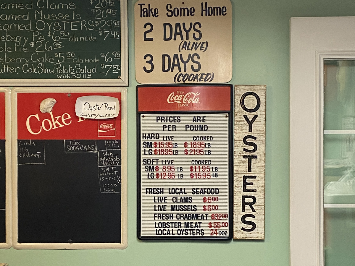 여기서는 바로 쪄서 먹을 살아있는 랍스터를 직접 고르는데, 껍질이 딱딱한(hard) 또는 부드러운(soft) 두 종류에 또 크기에 따라서 작고 큰 것들이 미리 나누어져 있어서 파운드 당 단가가 4개나 표시되어 있는게 보인다. 우리는 부드러운 껍질의 작은 놈들 중에서는 큰 것으로 하나만 고르고 랍스터롤을 추가로 시켰다.