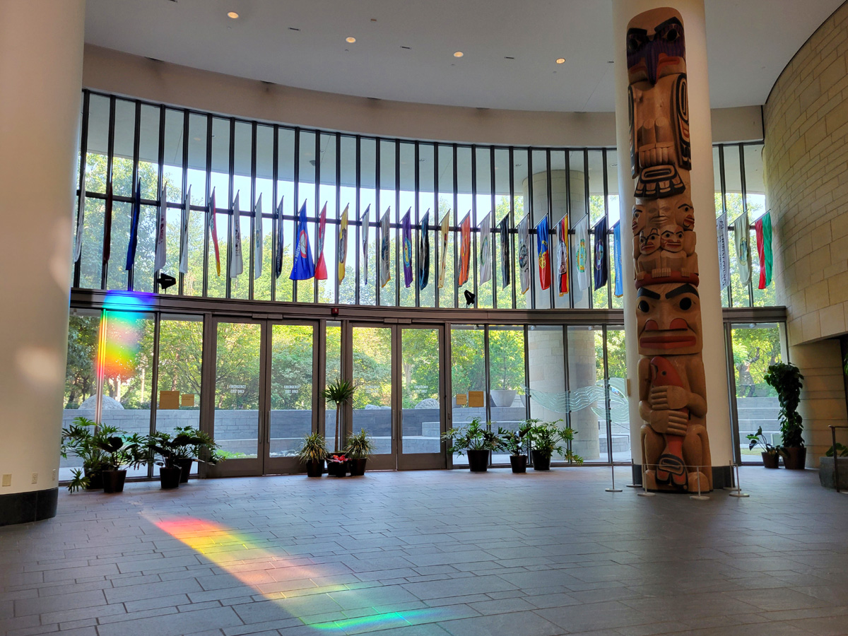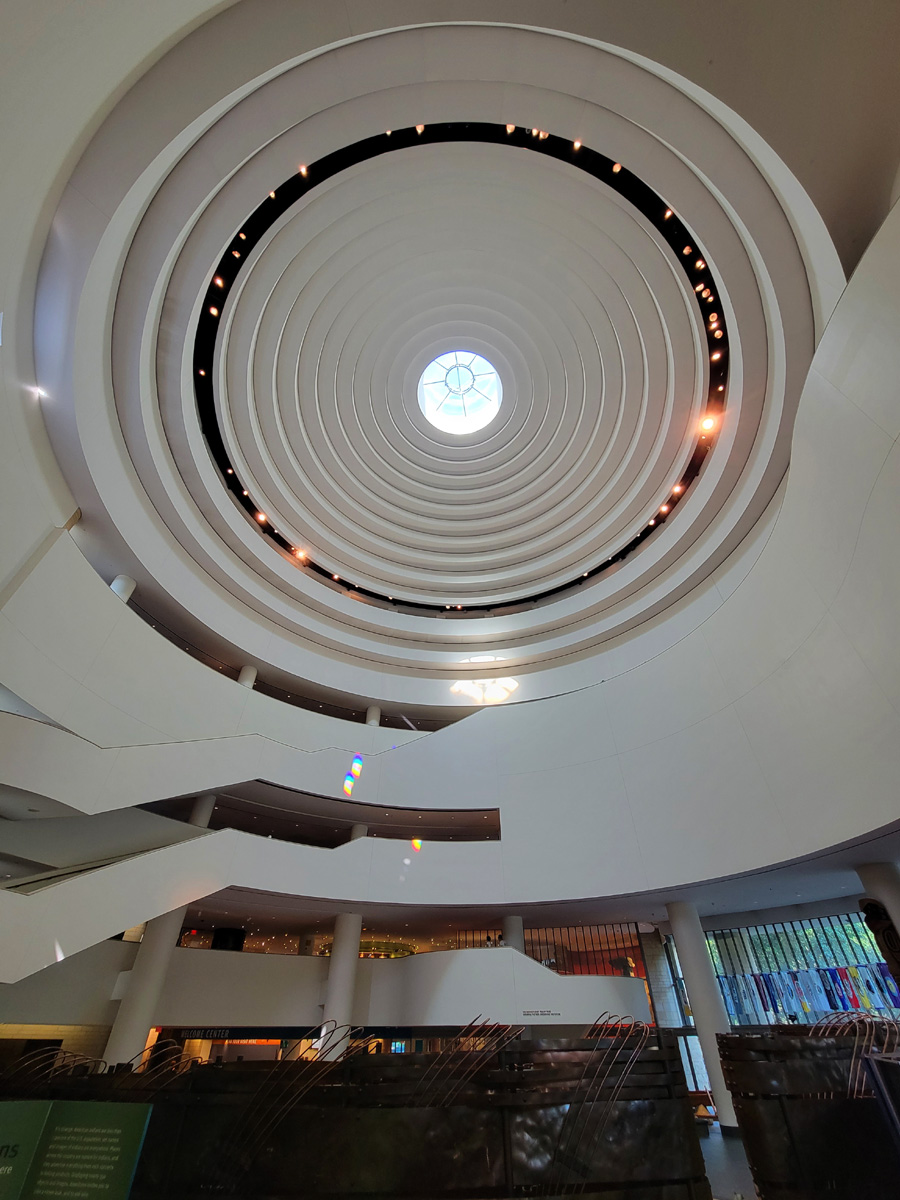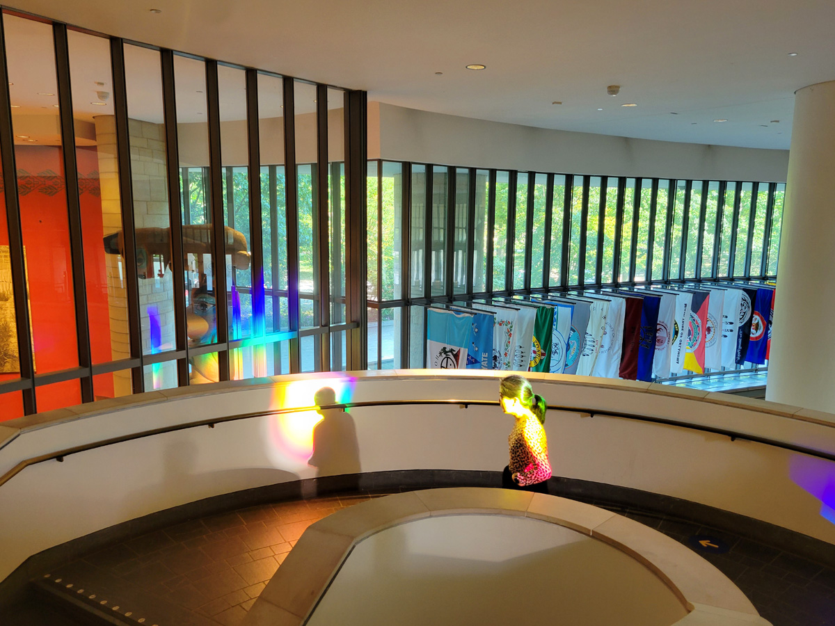 바닥에는 아까와는 다른 프리즘이 또 길죽한 무지개빛을 비추고 있었고, 중앙홀을 떠받히는 기둥에는 2009년 30일간의 자동차여행에서 방문했던 캐나다 밴쿠버 스탠리파크에서 봤던 것과 비슷한 토템폴(Totem Pole)이 세워져 있는데, 알래스카 심션(Tsimshian) 부족의 <Eagle and the Young Chief>라는 작품이란다.