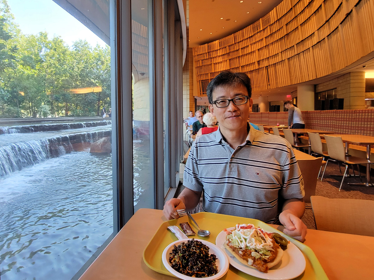 인디안밥을 우유에 말아서 점심으로 먹은 것은 아니고...^^ 나바호식 타코와 닭요리를 주문했다. 이 카페의 주방장이 나바호족 출신 요리사인데다, 1층에 있는 넓고 은은한 실내에서 창밖으로는 폭포수가 흘러가는 풍경을 보며 식사를 할 수 있어서, 이 박물관은 전시보다는 여기 식당으로 더 유명하다는 리뷰를 종종 볼 수 있다.