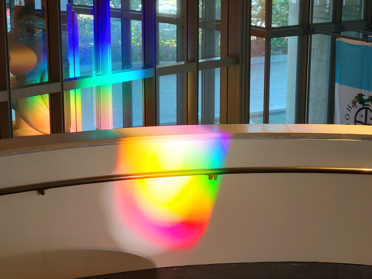 하지만 지나간 후에도 그 자리에 그대로 남아있어서 살펴보니, 건물의 남쪽 벽에 군데군데 구멍을 뚫어서 거대한 프리즘을 설치해놓아서 햇빛이 들어오며 산란된 것이었다. 하늘의 무지개 말고 이런 프리즘에 의한 또렷한 '빨주노초파남보'는 정말 오래간만에 보는 것 같았다.