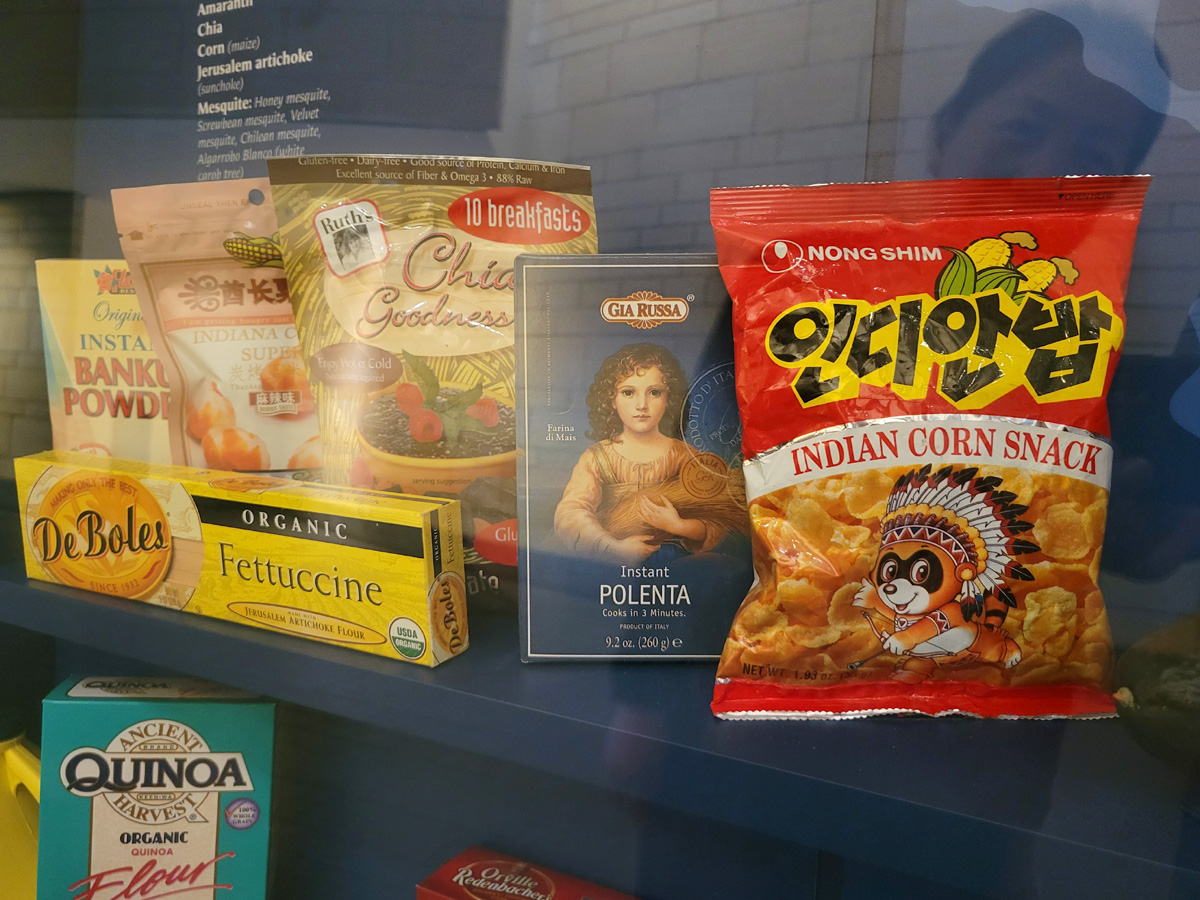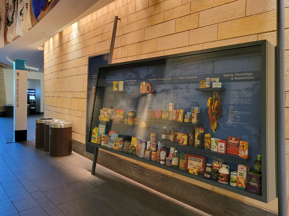 Mitsitam Native Foods Cafe 식당으로 들어가는 길 옆에는 인디언들이 사용했던 그릇 등의 주방도구와 함께, 인디언 고유의 식품이 현재 전세계에 어떻게 퍼져있는지를 보여주는 사진의 전시가 만들어져 있는데 그 한가운데에...