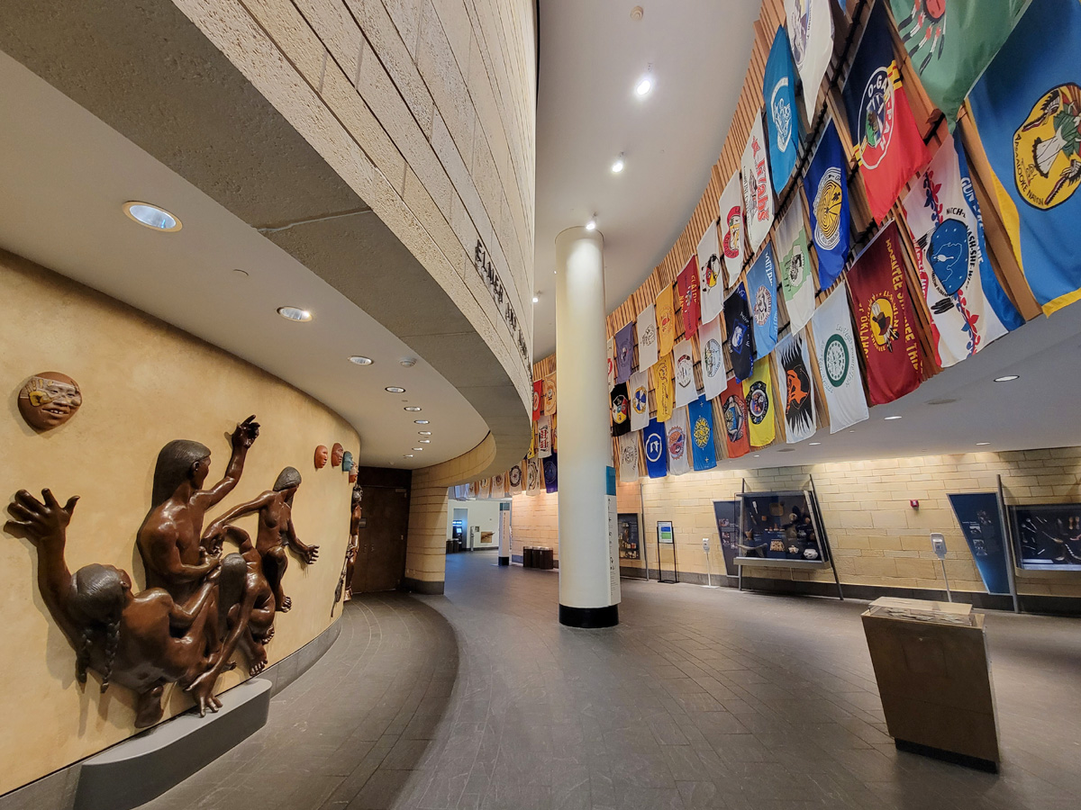 1층에는 안내소 외에 대극장인 Rasmuson Theater와 식당만 자리잡고 있는데, 극장을 둘러싸고 미국내 여러 인디언 부족의 깃발이 걸려있다. 여기서 엘리베이터를 타고 바로 제일 위 전시실이 있는 4층으로 올라갔다.