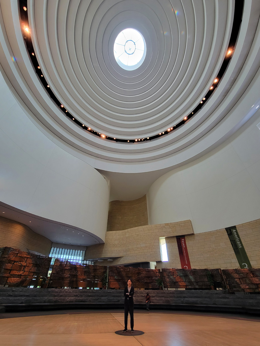 멋진 카페에서 식사를 잘 마치고 포토맥 아트리움(Potomac Atrium)이란 중앙홀 한가운데에 선 아내이다. 동그란 바닥이 정확히 4등분이 되어있고 주변에 인디언 부족의 깃발들도 보이니까, 우리 둘 다 동시에 역시 또 미서부의 '포코너(Four Corners)' 추억이 떠올랐다. (해당 여행기를 보시려면 여기를 클릭)