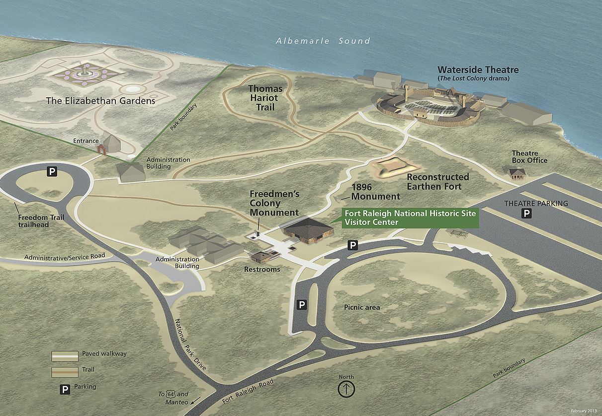 섬의 제일 북쪽에 포트롤리 국립사적지(Fort Raleigh National Historic Site)가 있는데, 그 밑에 별도로 적혀있는 두 곳은 아래의 공원지도를 보며 설명을 드리기로 한다. 참고로 노스캐롤라이나 주도(state capital)도 같은 사람의 이름을 딴 롤리(Raleigh)인데, 실제 영어발음은 '랄리'에 가깝지만 대부분의 한글 사이트에서 '롤리'로 표기를 해서 그에 따르기로 한다.