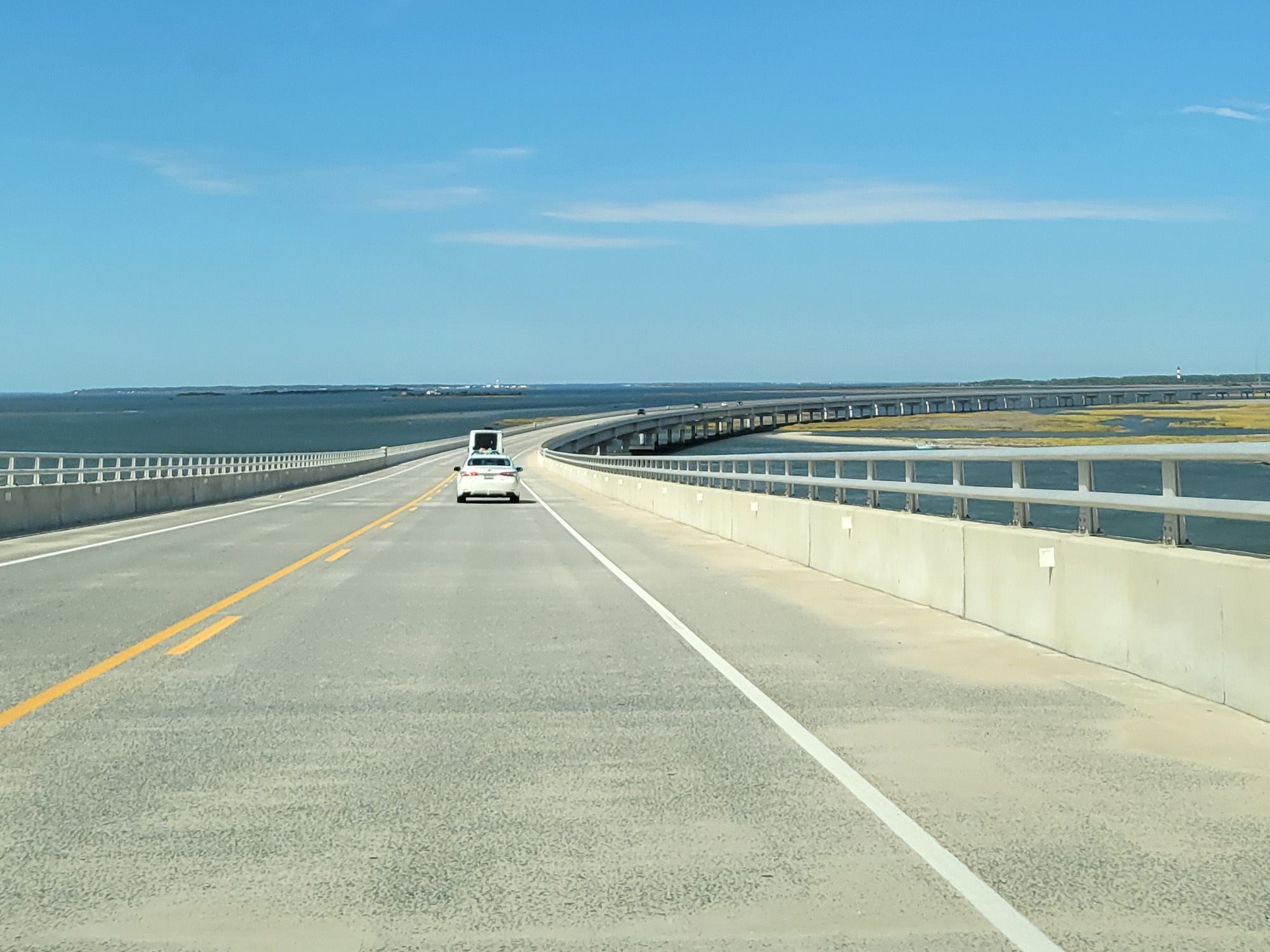 전편에서 소개한 미국에서 가장 높은 등대를 구경하고 (여행기를 보시려면 클릭), 노스캐롤라이나(North Carolina) 주의 해안을 따라 길게 만들어진 섬들을 이어주는 다리를 달려 북쪽으로 올라가고 있다. 사진 정면에 나지막히 건물들이 보이는 땅이 그 평행사도(Barrier Island) 안쪽에 있는 로어노크 섬(Roanoke Island)으로, 이제 찾아가는 유적지가 있는 곳이다.