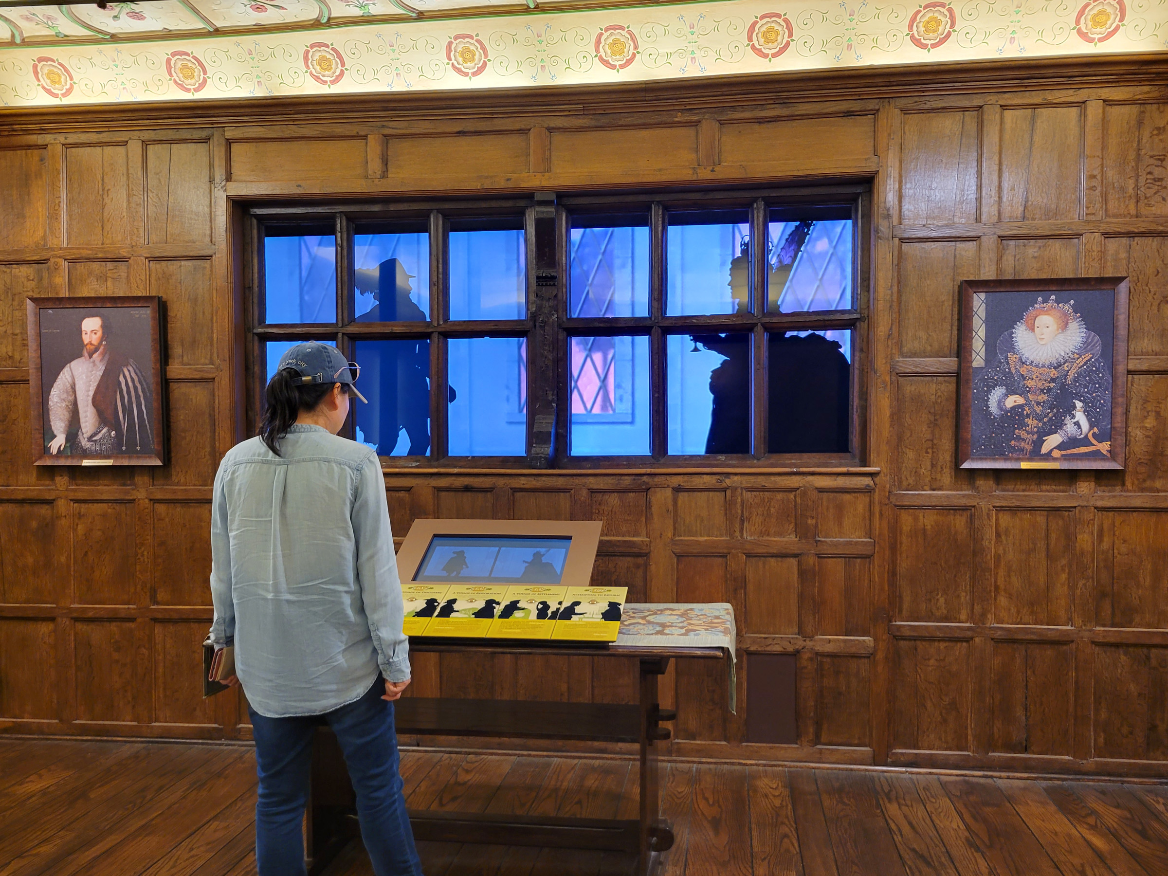 이상의 내용을 모두 보여주는 안내영화를 재미있게 보고 다른 전시실로 들어갔더니, 그 곳에는 왼쪽의 월터 롤리 경과 오른쪽의 엘리자베스 1세 여왕이 신대륙 탐험에 대해 이야기를 나누고 있었다. 창문 너머 실루엣으로 보이는 두 명이 움직이면서 실제 대화를 하는 영상이 나오는데, 아내가 조종판 앞에서 꼼꼼히 내용을 읽어보고 있는 모습이다. 롤리는 영국의 정치인, 탐험가, 작가, 시인이자 영국 여왕 엘리자베스 1세의 총신으로, 진흙길 위에 자신의 값진 망토를 펼쳐 엘리자베스 1세를 지나가게 했다는 일화로 유명하며, 일설에는 그가 엘리자베스 1세의 숨겨진 애인이라는 주장도 있단다.