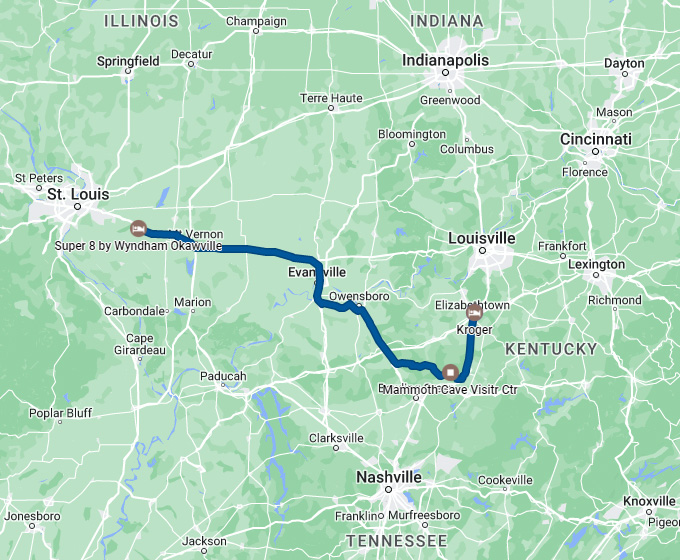 구글 타임라인에 기록된 2차 대륙횡단 11일차의 전체 이동경로로, 아침에 일리노이주 오카우빌(Okawville)을 출발해 4시간을 달려서 국립공원을 구경하고, 1시간 떨어진 켄터키주 엘리자베스타운(Elizabethtown)에 숙박했다. 지도 남쪽에 1차 대륙횡단에서 지나갔던 테네시주 내슈빌(Nashville)이 가까이 보이는데, 만약 1차에 이 국립공원까지 올라와 구경했었다면 2차에는 세인트루이스에서 북쪽으로 방향을 잡아 지도 위쪽의 스프링필드, 인디애나폴리스, 신시내티 등의 도시들을 구경하며 동쪽으로 갔을지도 모르겠다.