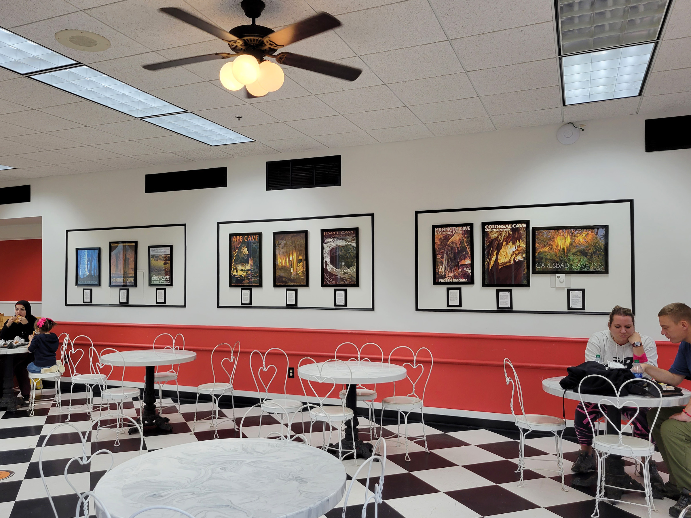 점심을 사먹기 위해 건너편 카페를 찾았는데, 벽면에 이 곳의 여러 동굴과 함께 미국의 다른 동굴들의 사진도 걸어놓았다. 자세히 보면 처음 소개한 다른 두 국립공원은 물론이고, 가운데 칸에 역시 우리가 방문했던 쥬얼케이브 준국립공원(Jewel Cave National Monument)의 포스터도 보인다.