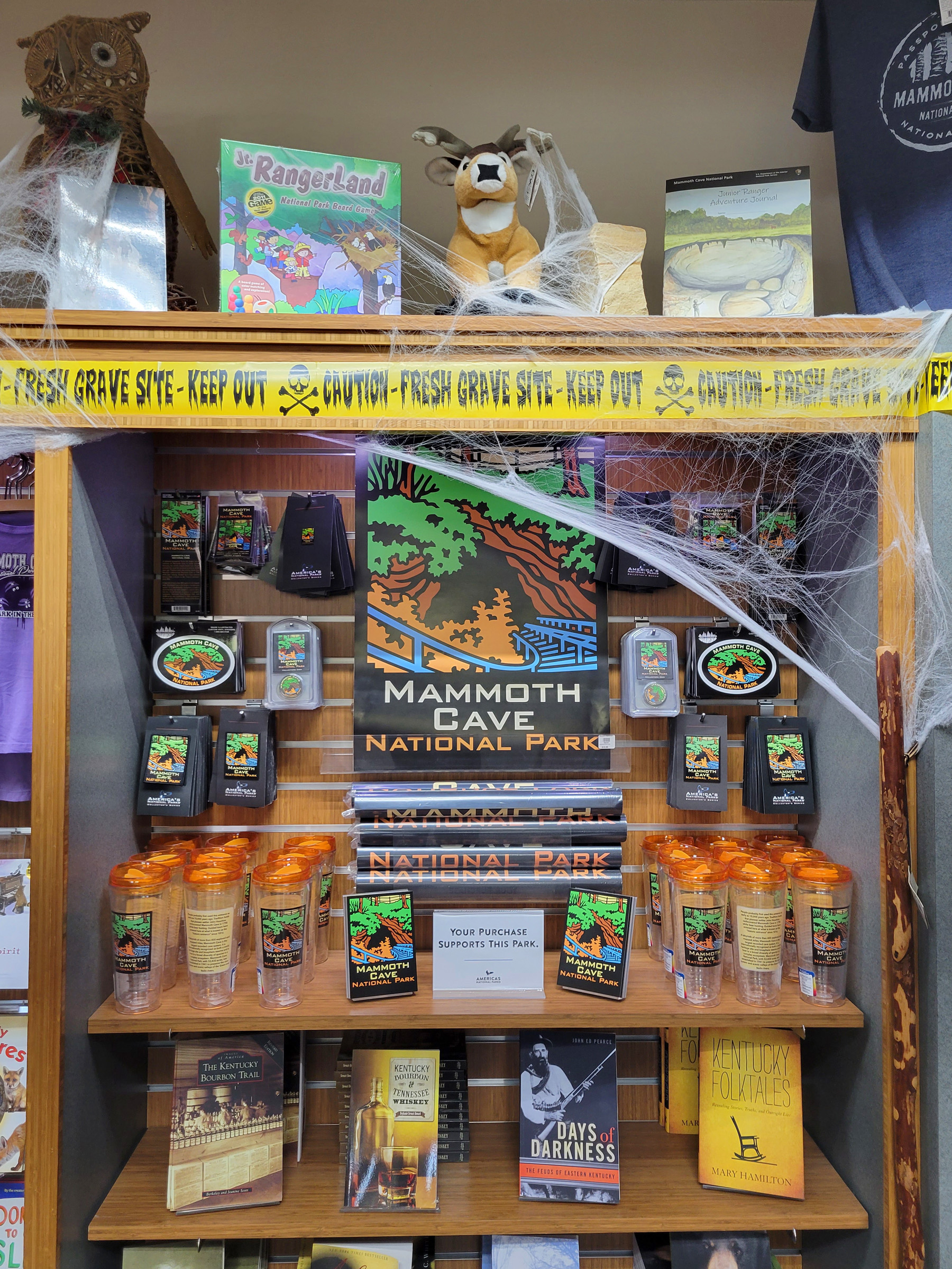 기념품 가게에 들어갔더니 핼러윈을 앞두고 이렇게 거미줄과 테이프로 벽장을 장식해놓았다. 제일 아랫줄 왼쪽에 버번트레일(Bourbon Trail)에 관한 책이 보이는데, 앞서 소개한 것처럼 켄터키에서 양조업이 발달할 수 있었던 이유도, 카르스트 지형으로 인해 위스키를 만들기 좋은 지하수를 쉽게 구할 수 있어서라고 한다.