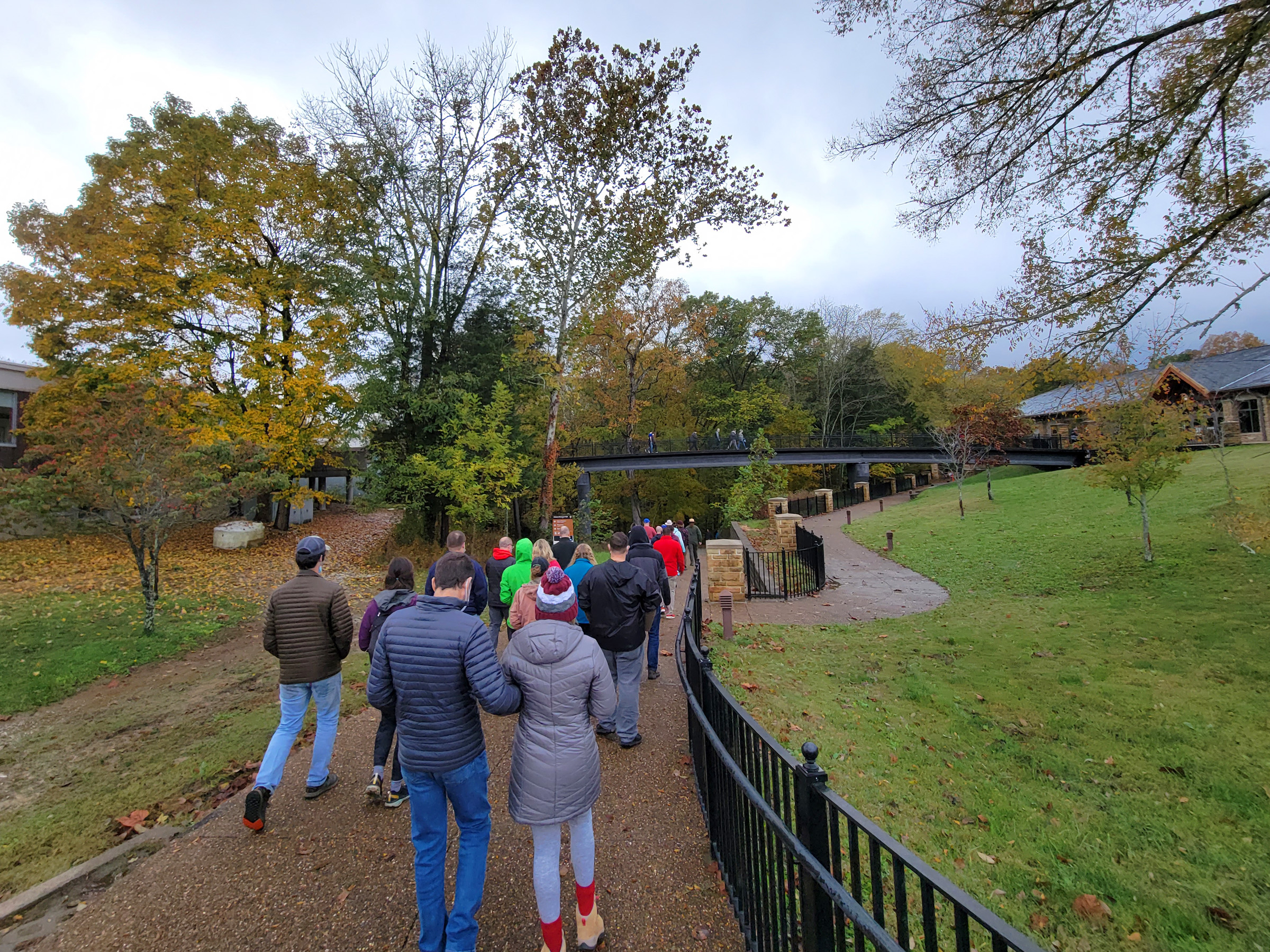 인원이 다 모인 후에 비지터센터 뒤쪽에 있는 동굴입구로 걸어가고 있는 우리 일행들인데, 오른쪽 비지터센터에서 왼쪽에 우리가 점심을 먹었던 카페가 있는 호텔 건물을 연결하는 구름다리가 보인다. 저 다리가 있는 줄 모르고 우리는 차를 몰고 빙 돌아서 왔다갔다 했었다는...^^