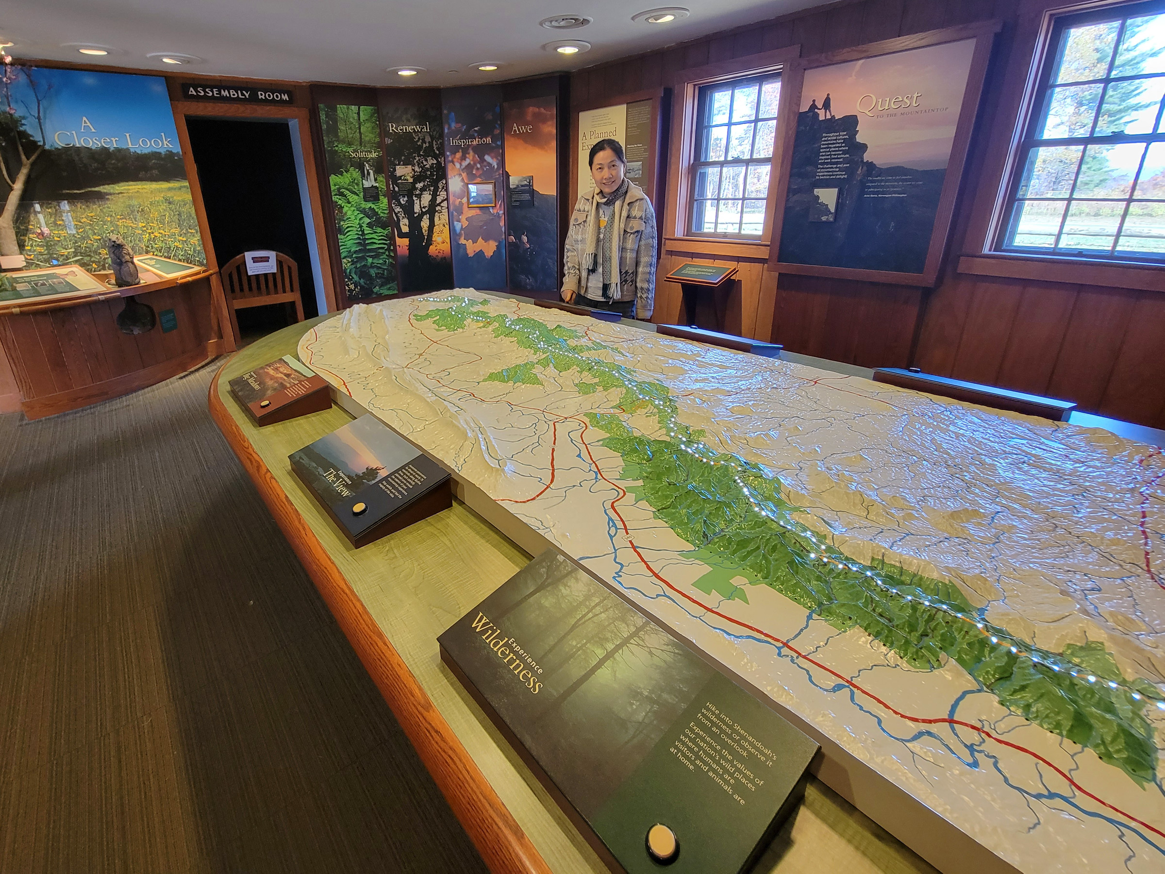 전시실에 남북으로 길쭉한 셰넌도어 국립공원의 모형이 만들어져 있는데, 아내가 버튼을 누르자 능선을 따라 만들어진 전체길이가 약 170 km나 되는 경관도로인 스카이라인 드라이브(Skyline Drive)에 불이 들어왔다. (공원지도를 보시려면 여기를 클릭해서 1차 대륙횡단 여행기를 보시면 됨)