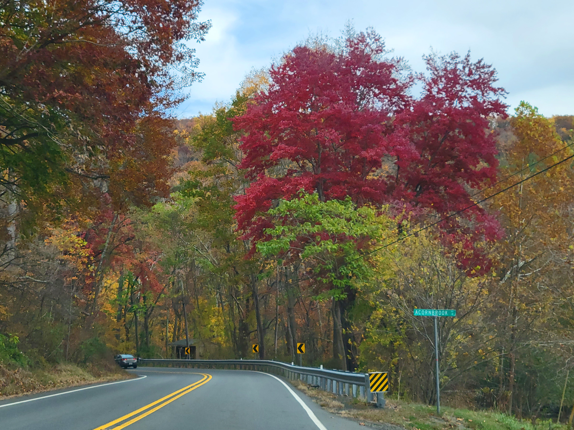햇살의 방향과 도로의 미세한 높낮이에 따라서 단풍이 절정인 구간도 있고, 벌써 다 떨어져서 앙상한 나뭇가지만 보이는 곳들도 있었다. 하루이틀만 더 지나면 저 노란색과 주황색의 잎들도 모두 떨어질 듯 아슬아슬했다.
