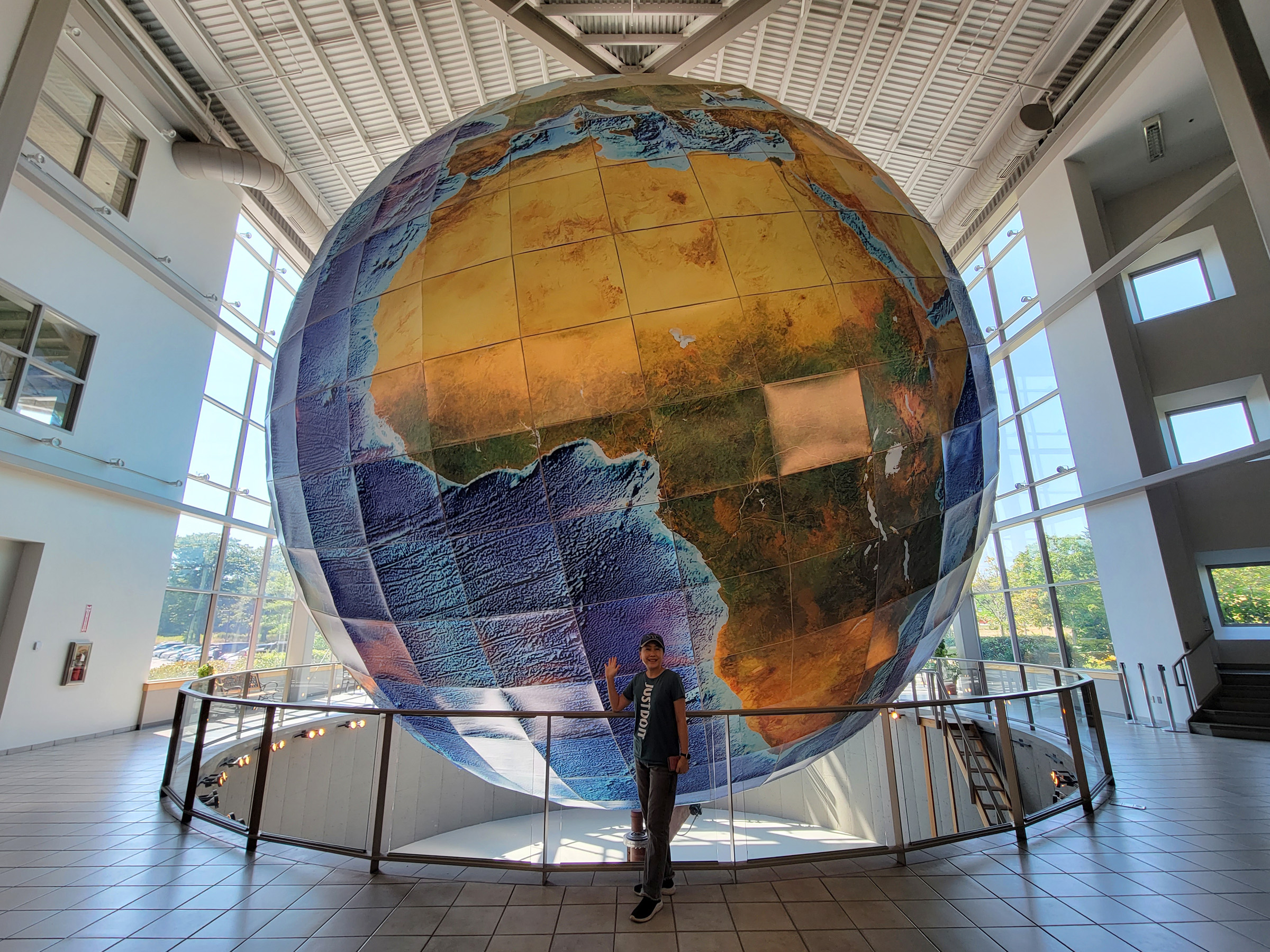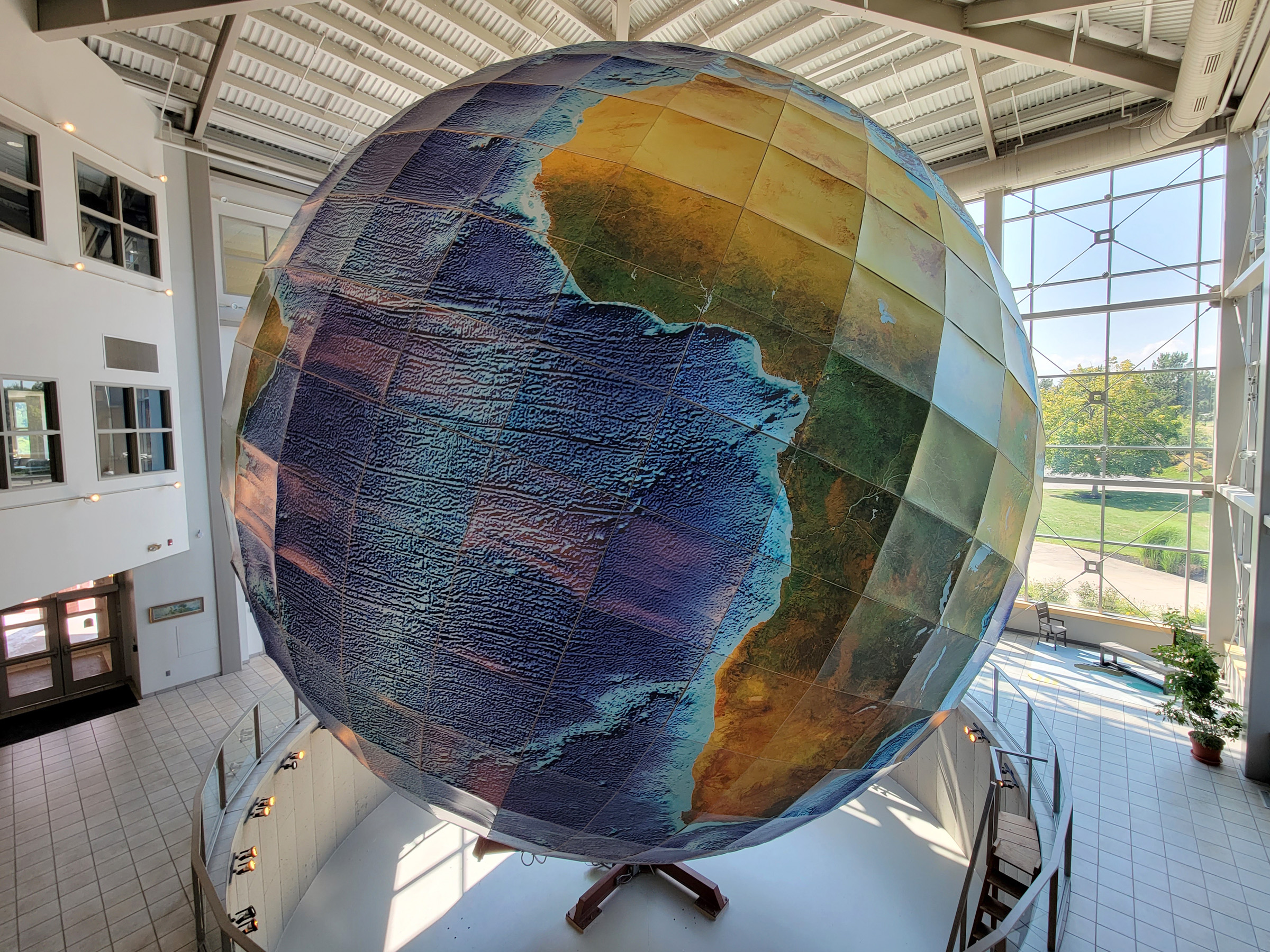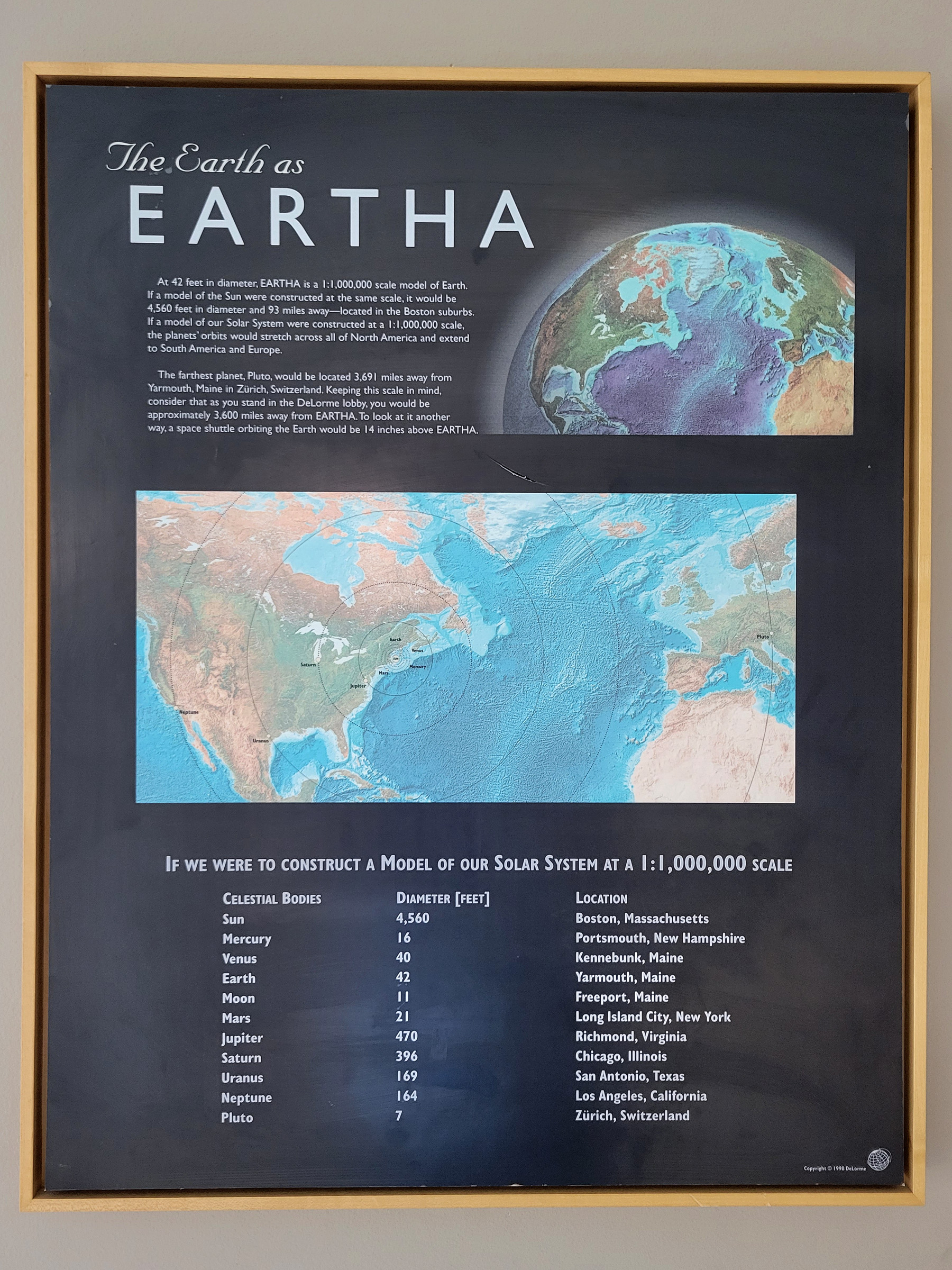 1976년에 메인주 출신의 David DeLorme이 창업한 지도 제작사인 들로름(DeLorme)이, 1999년에 여기 야머스에 본사 건물을 신축하면서 이 거대한 지구본을 함께 만들었는데, 그 회사가 2016년에 가민(Garmin)에 인수되어서 건물 입구에 가민의 상호가 있었던 것이다. 전망대 2층에서 구경한 후에 아내가 사람이 옆에 있어야 크기를 알 수 있다며 먼저 내려가고 위기주부는 3층으로 올라갔다.