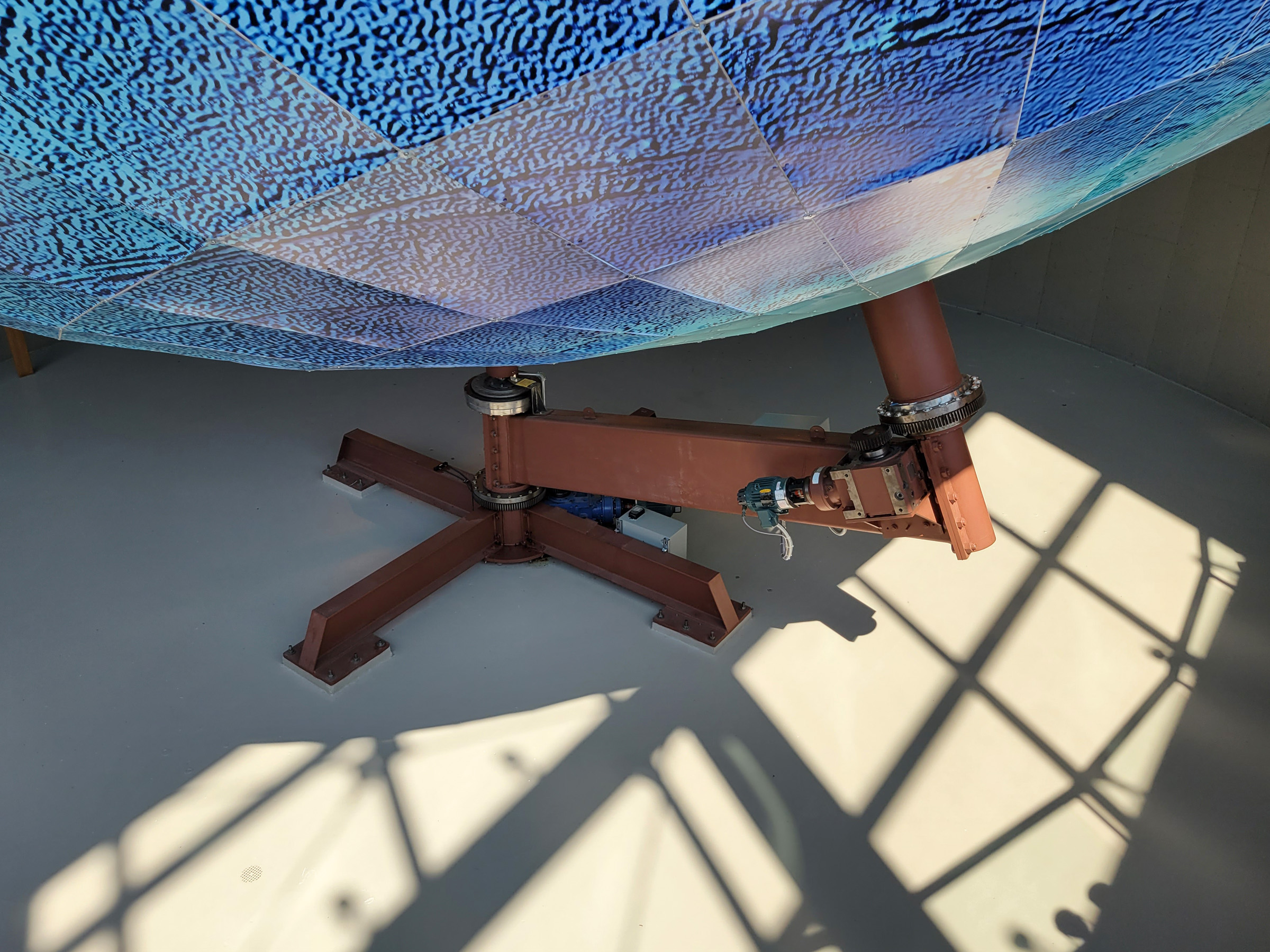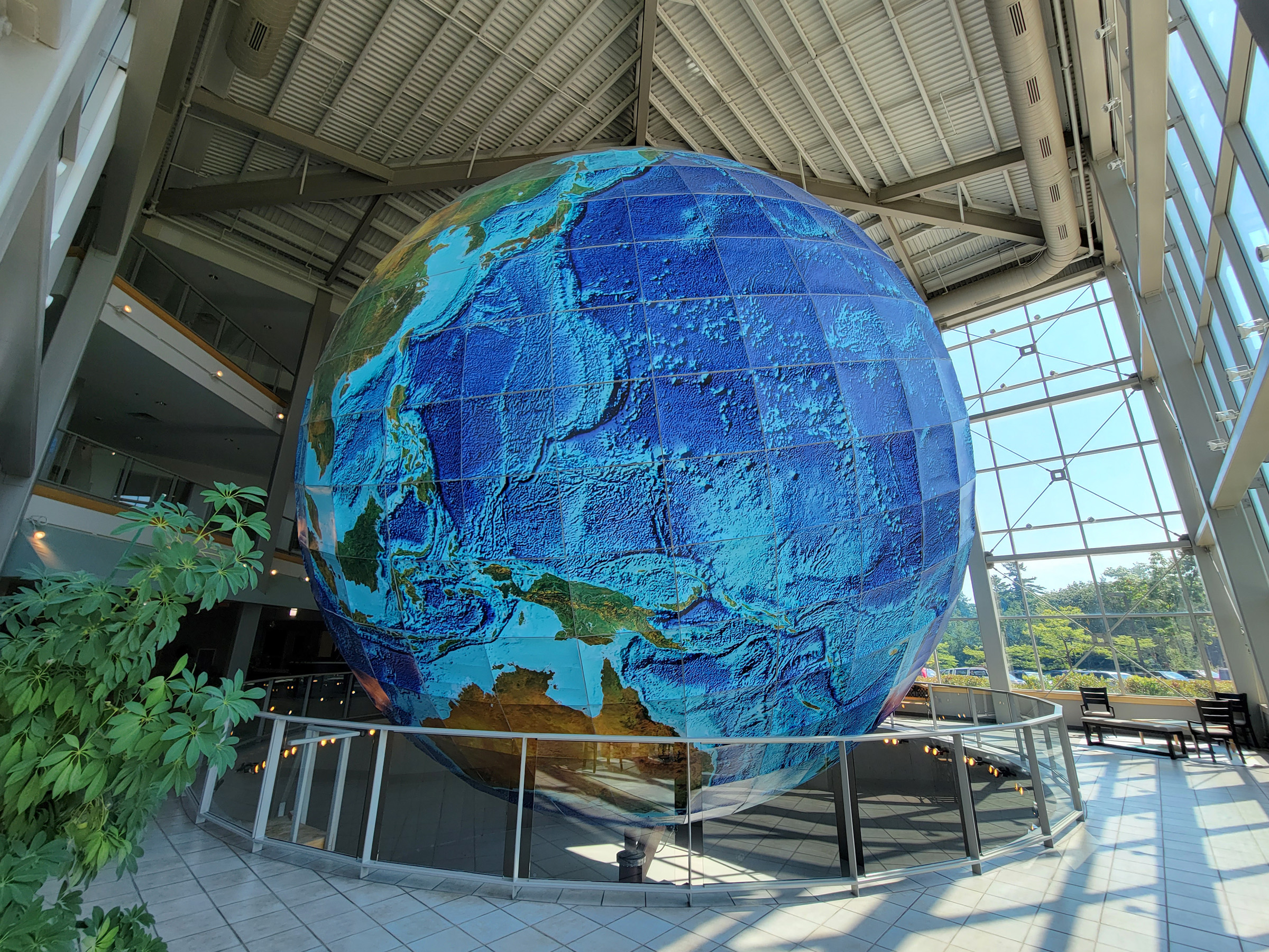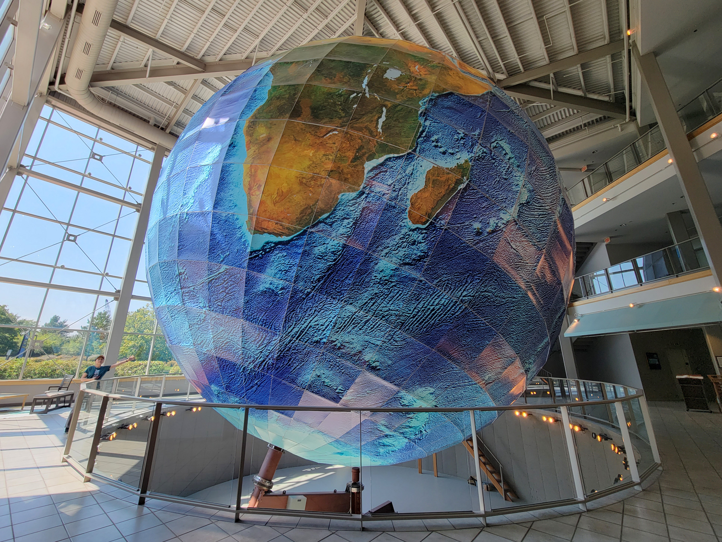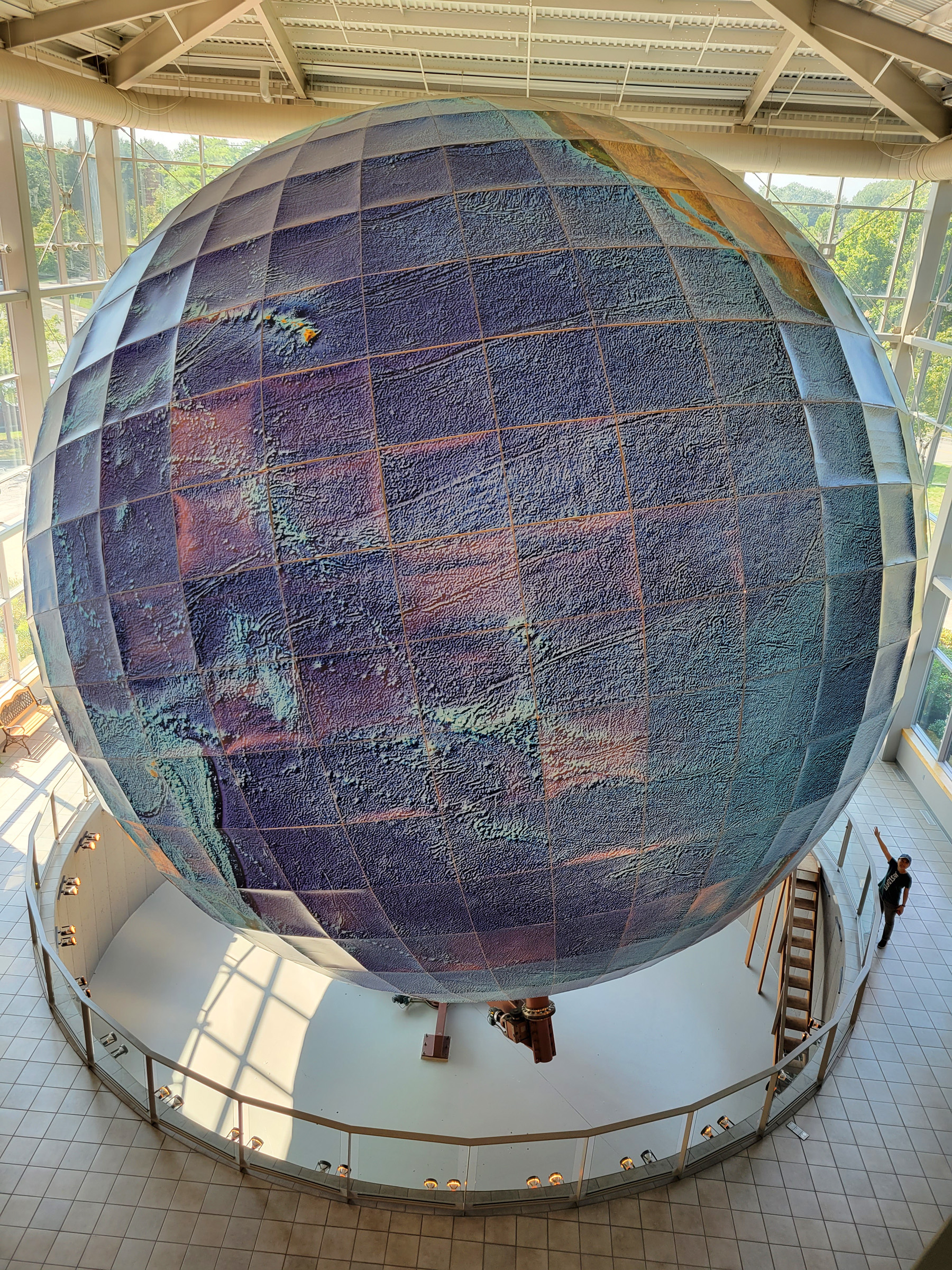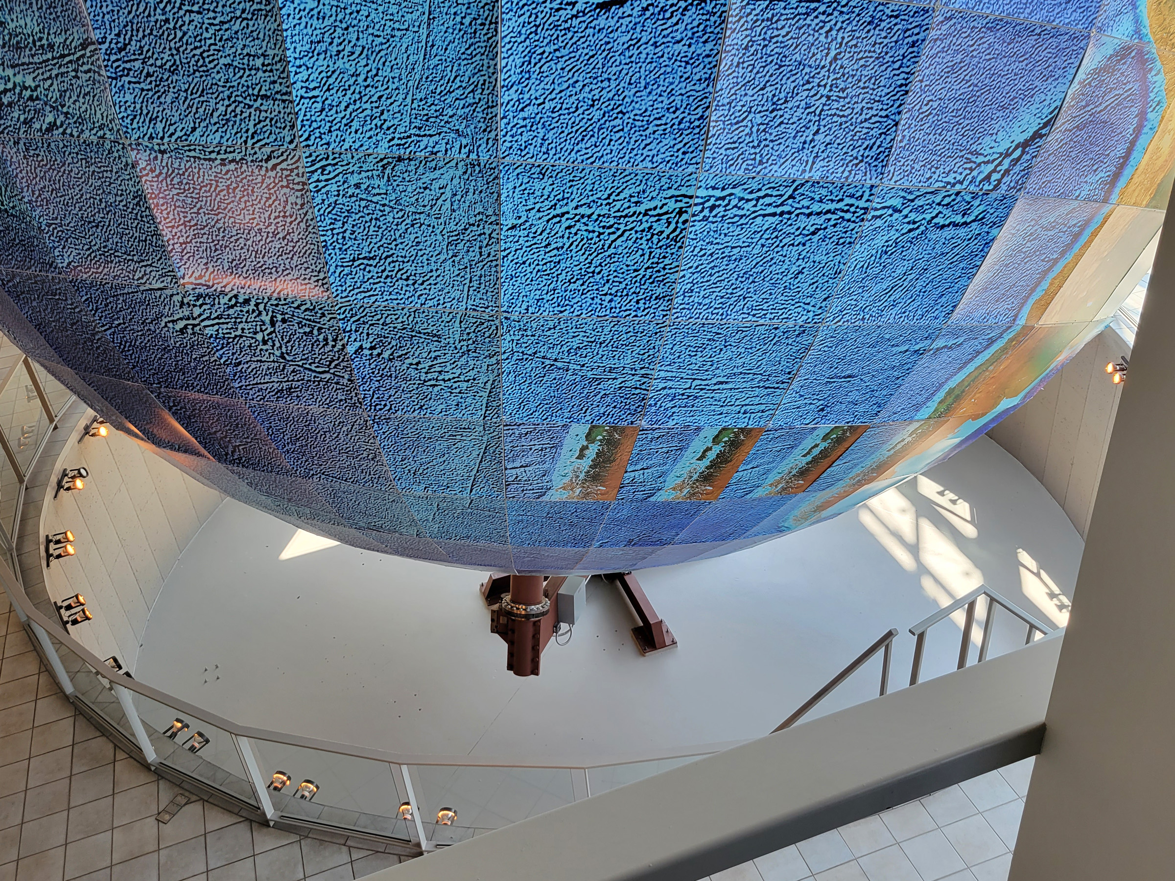 하필이면 노란 육지는 다 지나가고 파란 태평양만 보이는데, 사실 깨끗하고 반질한 지구본을 기대했다면 좀 실망할 수도 있었다. 위도(latitude)는 8도, 경도(longitude)는 10도 간격으로 나누어 약 6천개의 알루미늄 파이프로 골격을 조립한 후에 각 칸에 해당하는 792개의 지도를 프린트해서 붙였는데, 이 때 사용된 데이터의 양이 140GB나 되었다고 한다. (1990년대말에 개인PC의 하드디스크 용량이 잘해야 1GB 정도였던 것을 감안하면 엄청난 데이터 양임)