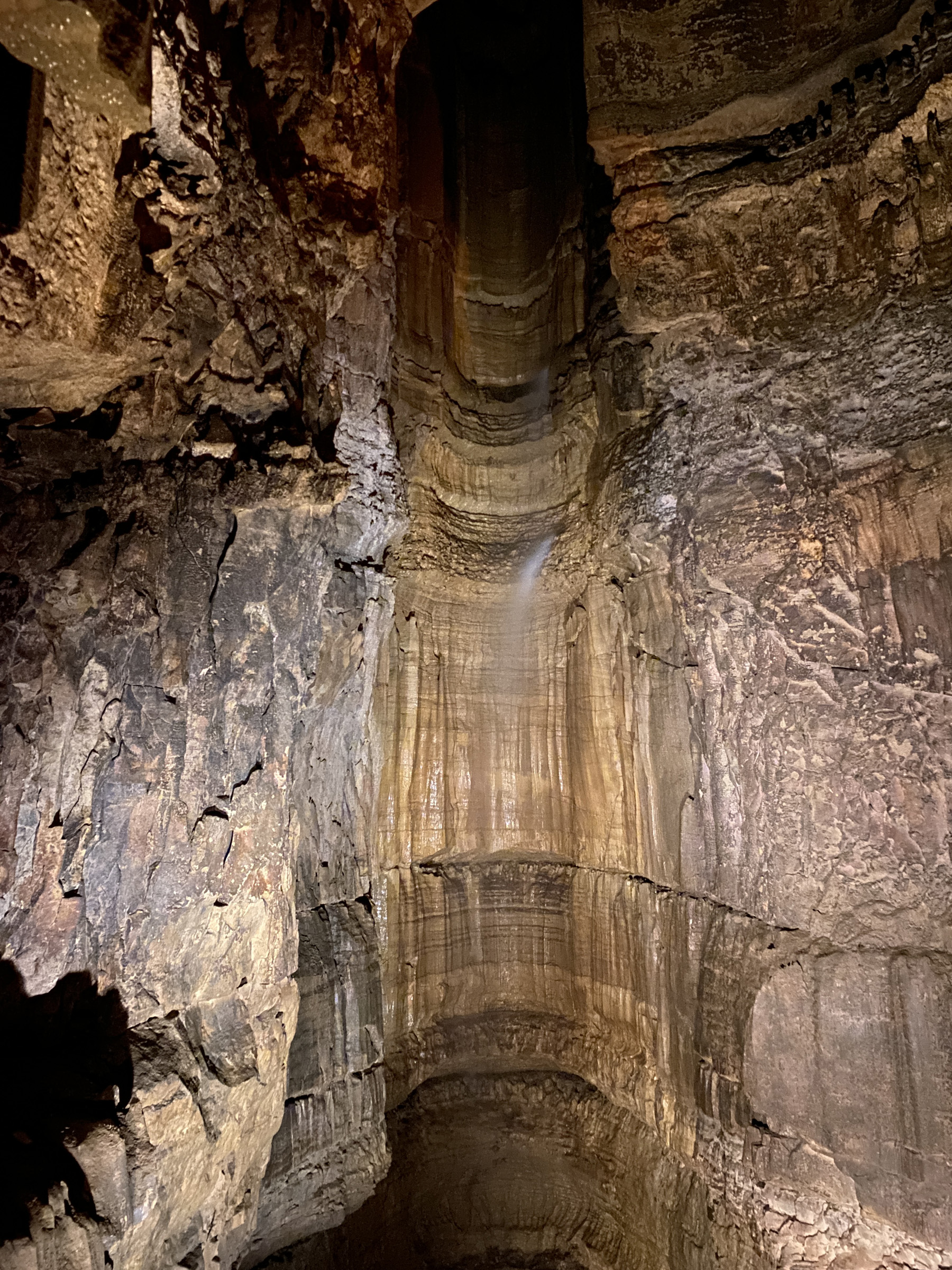 맘모스돔(Mammoth Dome) 아래로 바위를 깍으며 수직으로 떨어지는 지하폭포를 볼 수 있다. 사진으로는 가운데 희미한 물줄기만 보이지만, 마지막에 소개하는 유튜브 영상의 뒷부분을 보시면 조명을 받으며 떨어지는 폭포수의 모습을 소리와 함께 보실 수 있다.