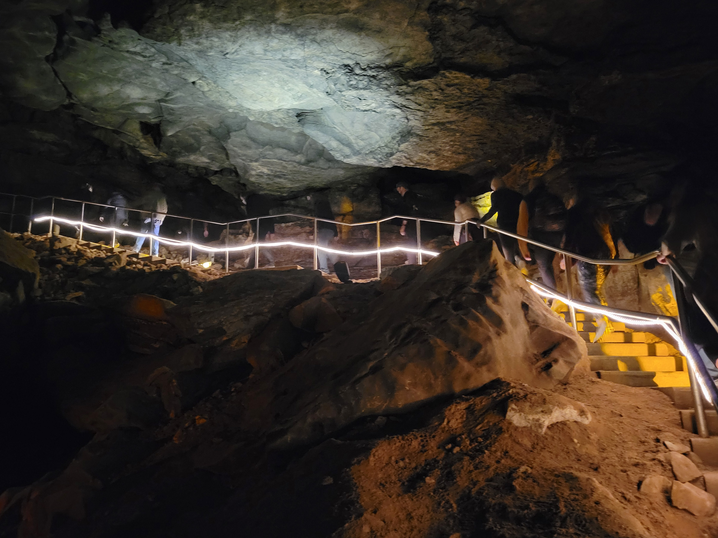 좁은 길을 무사히 다 빠져나와서 사람들이 안도하는 곳이 투어에서 가장 깊이 내려온 지하 280피트의 Great Relief Hall이고, 거기서 조금 더 걸어오면 여기 벤치가 잘 만들어져 있는 리버홀(River Hall)이 나왔다. 여기 갈림길에서 더 아래쪽으로 내려가면 전편에서 설명드렸던 지하에 흐르는 강과 호수를 볼 수 있다지만, 우리가 참가하는 히스토릭 투어는 이제 저 조명이 설치된 계단을 따라서 위로 올라가게 된다.