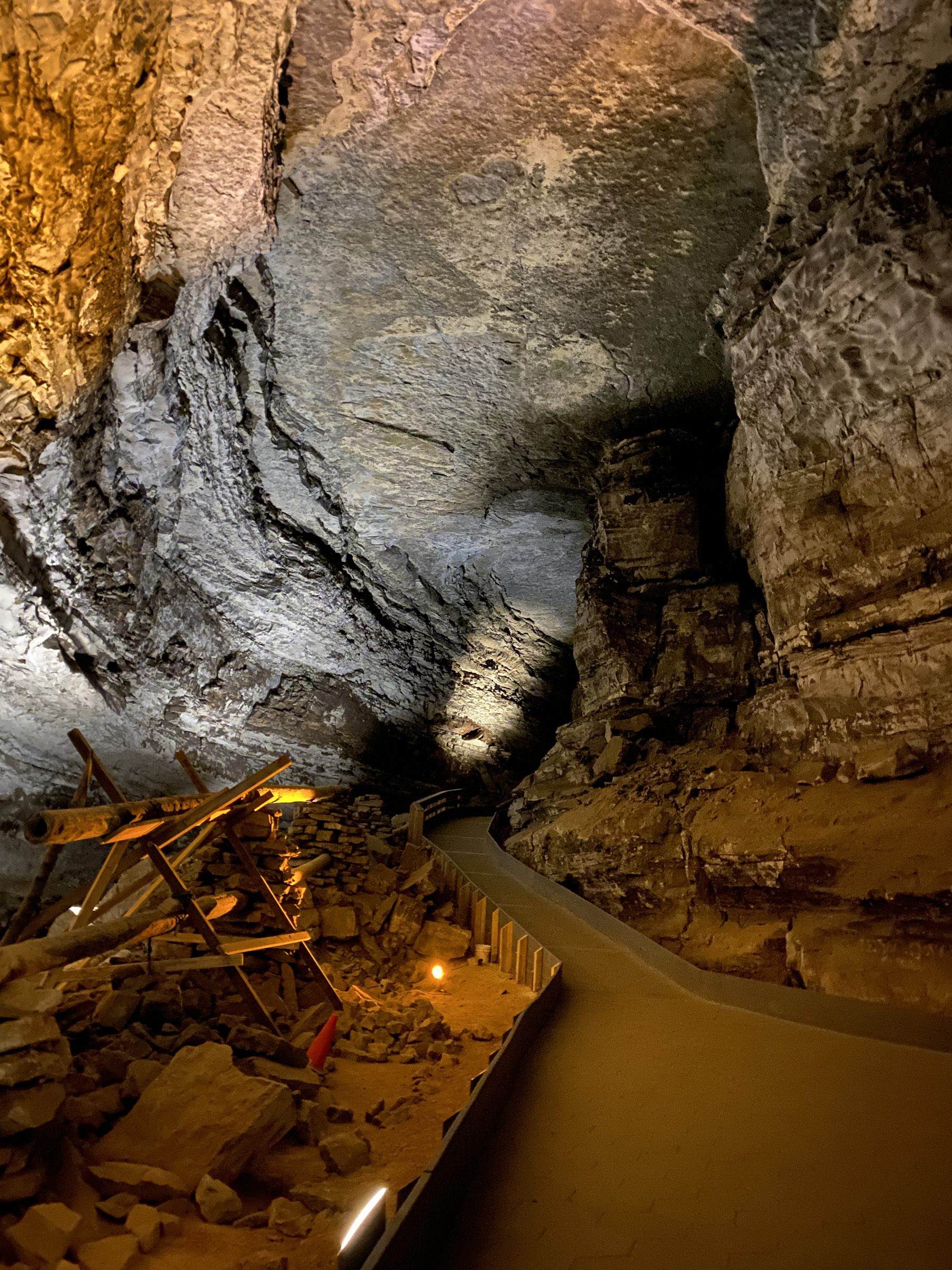 지하 140피트의 로툰다(Rotunda)에 도착하면 삼거리가 나오고 여기서부터 시계방향으로 루프를 돌게 되었다. 우리가 향하는 왼쪽 길의 옆으로는 돌과 목재를 쌓아서 나무 파이프(?)를 동굴속으로 계속 연결했던 흔적이 남아있는데, 옛날에 탄약의 원료가 되는 초석(saltpeter)을 채굴했던 광산이 있었기 때문이라고 한다.