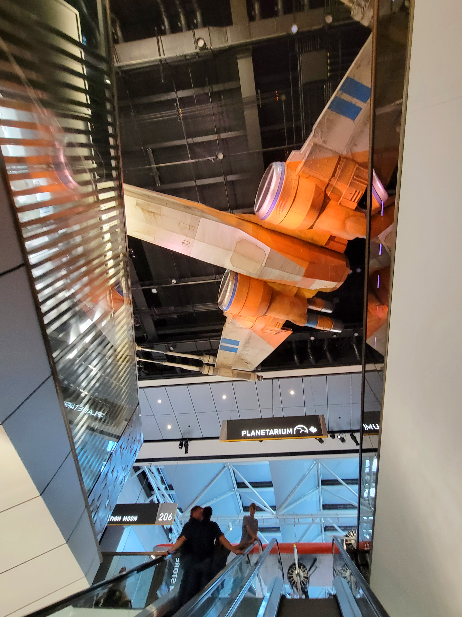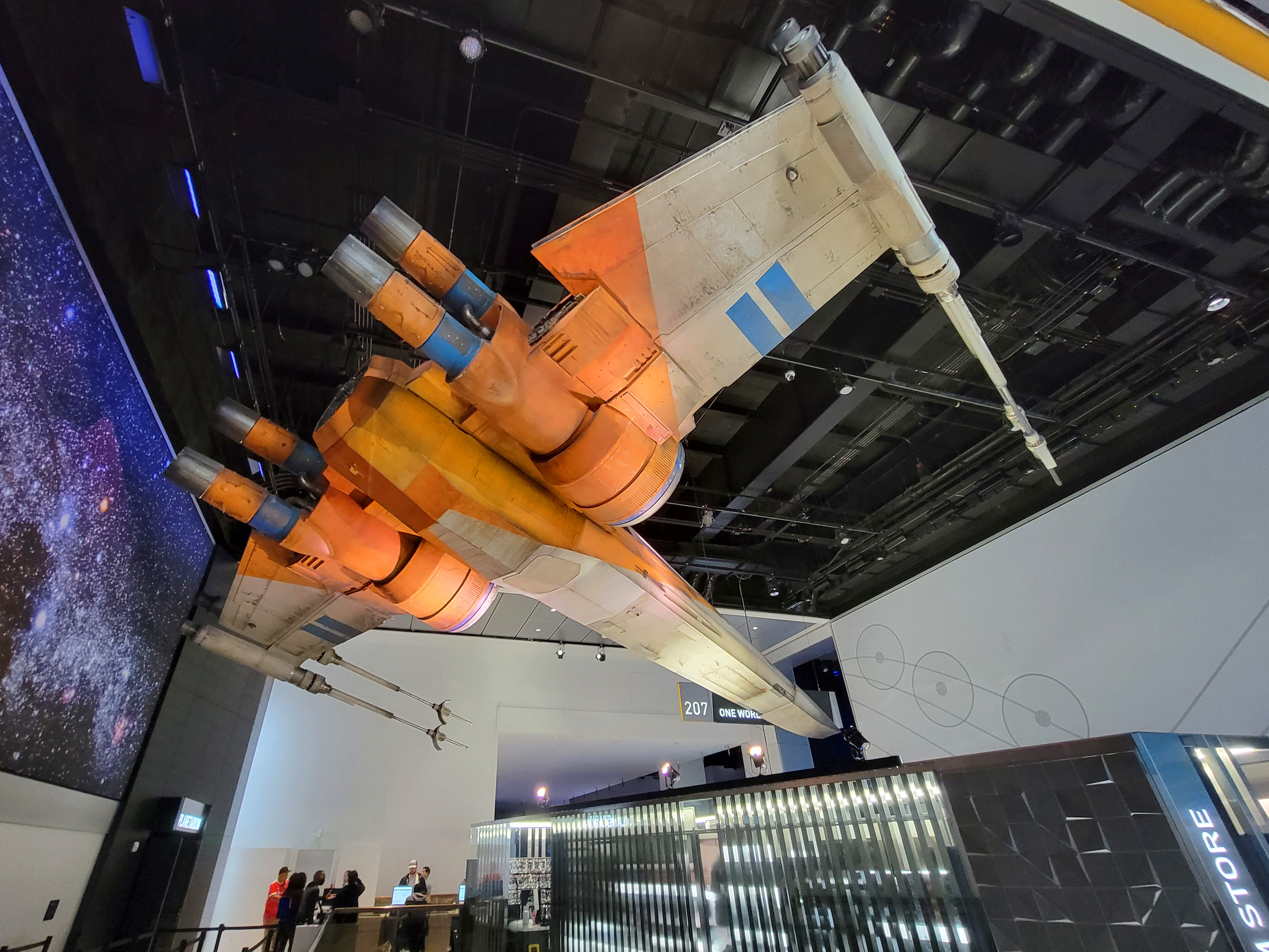 스타워즈(Star Wars)에 나오는 엑스윙(X-wing) 우주전투기가 실물 크기로 2층 천장에 매달려 있는데, 오렌지색의 도장으로 봐서 최근 영화 시리즈에서 저항군 리더로 나온 포 대머런(Poe Dameron)의 T-70으로 생각된다. 그런데, 엑스윙 전투기는 좌우 날개를 모두 상하로 벌려서 X자 모양인 상태로 전시를 해야 멋있는데...^^