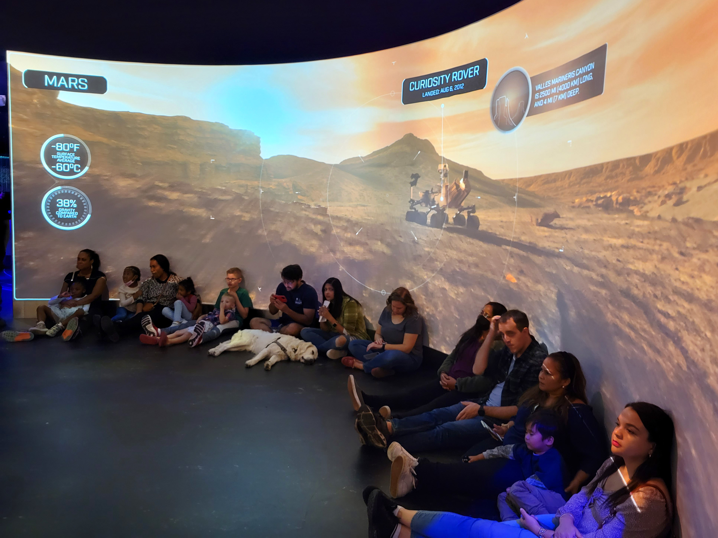 전시실 가운데 두 개의 원형스크린으로 만들어진 공간의 바닥에 앉아있는 이 분들과 개 한 마리는 지금 섭씨 영하 60도의 화성에서 큐리오시티와 함께 붉은 황무지를 돌아다니시는 중이다.^^