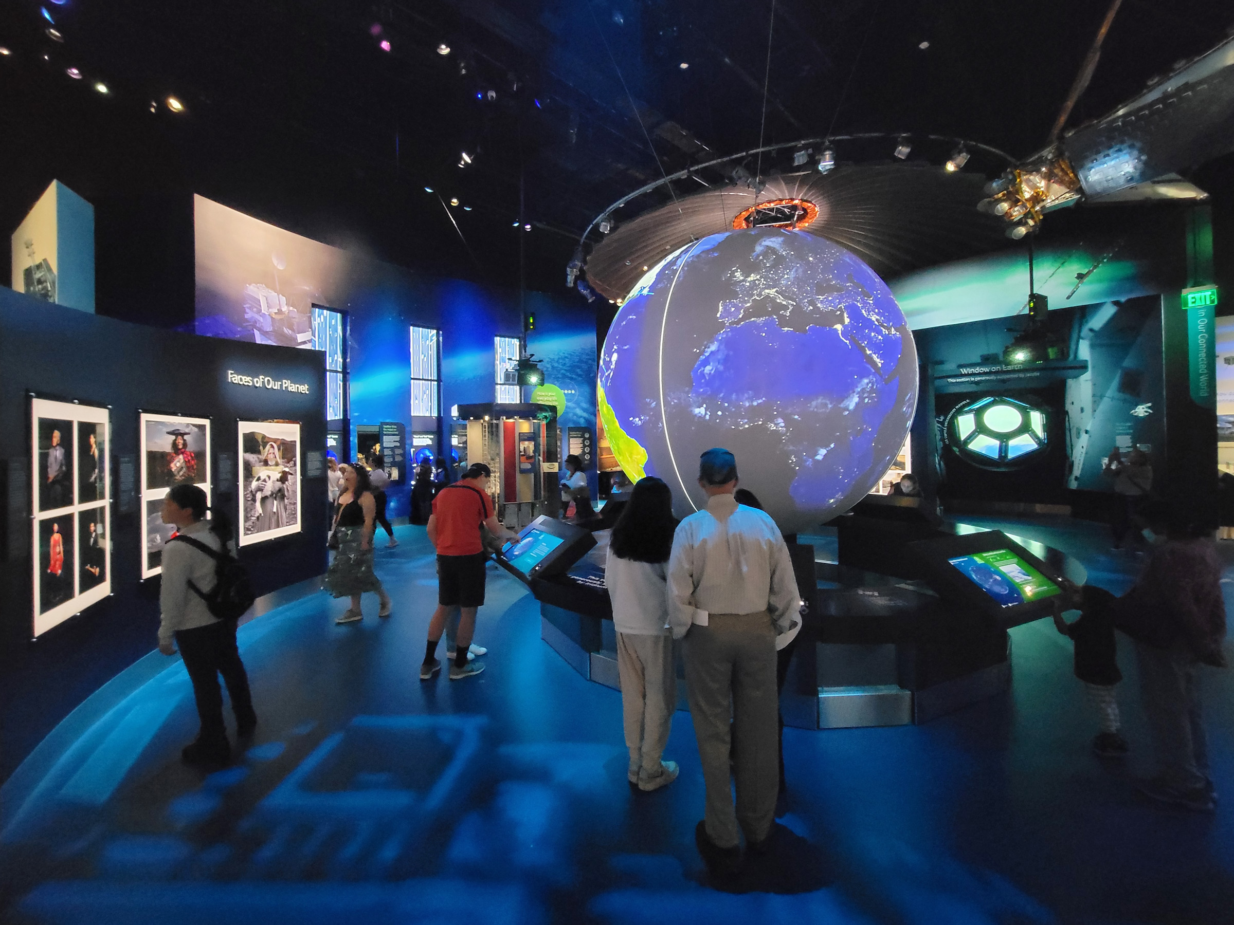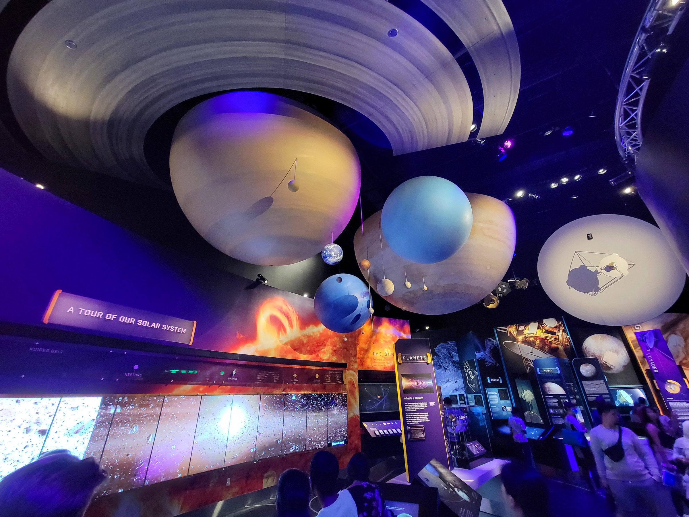 206호 <Exploring the Planets>로 들어가면 태양계의 행성들이 천장에 매달려 있는데, 사진 가운데 토성 아래로 우리 지구의 조그만 모습이 보인다. 가장 오른쪽에 회색으로 동그란 것은 행성이 아니고 태양계를 가로질러 비행했던 보이저 탐사선의 모형이다.