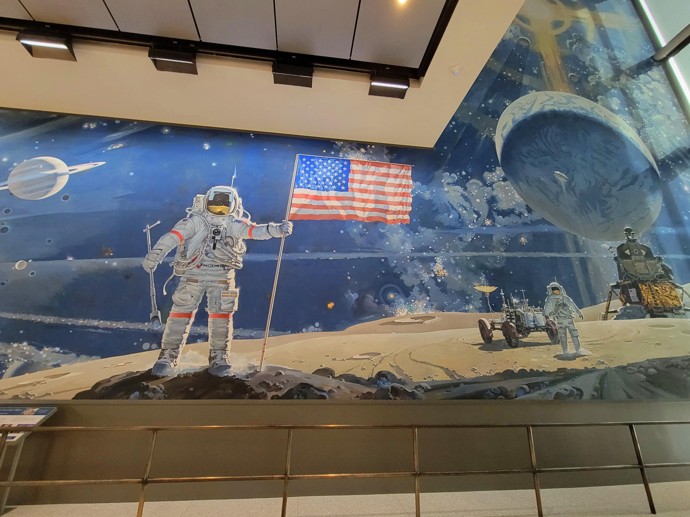 지하 마스카페(Mars Cafe)에서 커피를 마신 후에 전시실 비디오를 찍어 올려볼까 하다가 관람객이 너무 많아 그냥 관두고 1층 출구로 향했다. 아직 리모델링이 진행중인 동쪽 내부는 이렇게 옛날 아폴로 계획의 달 착륙선과 월면차, 그리고 성조기를 들고있는 우주인의 그림으로 가려져 있는데, 2025년 여름에야 공사를 완전히 끝내고 모든 전시실을 개장할 예정이라고 한다. 마침 이 글을 쓰는 전날 밤에 인류가 50여년만에 다시 달로 향하는 아르테미스 계획(Artemis Project)의 첫번째 SLS 로켓이 오리온 우주선을 싣고 성공적으로 발사가 되었는데, 내년에 유인 달궤도 비행의 2차 발사를 거쳐서, 최초로 여성과 유색인종 우주인 두 명이 다시 달에 발을 딛는 3차 발사도 같은 2025년으로 예정되어 있다고 한다.