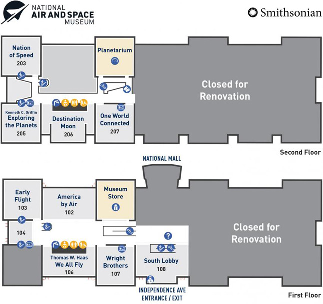 건물 1층과 2층의 지도로 전체 전시면적의 약 1/3 정도만 리노베이션을 끝내고 부분개장을 한 것을 알 수 있다. 올해 1월 1일에 방문했었던 버지니아에 있는 항공우주박물관 별관인 우드바-하지 센터(Steven F. Udvar-Hazy Center) 방문기에 썼던 것처럼, 이런 관심분야는 자세히 설명하자면 끝이 없으므로... 오픈한 8개 전시실의 대표사진 2장 정도씩만 간단히 차례로 소개를 한다.