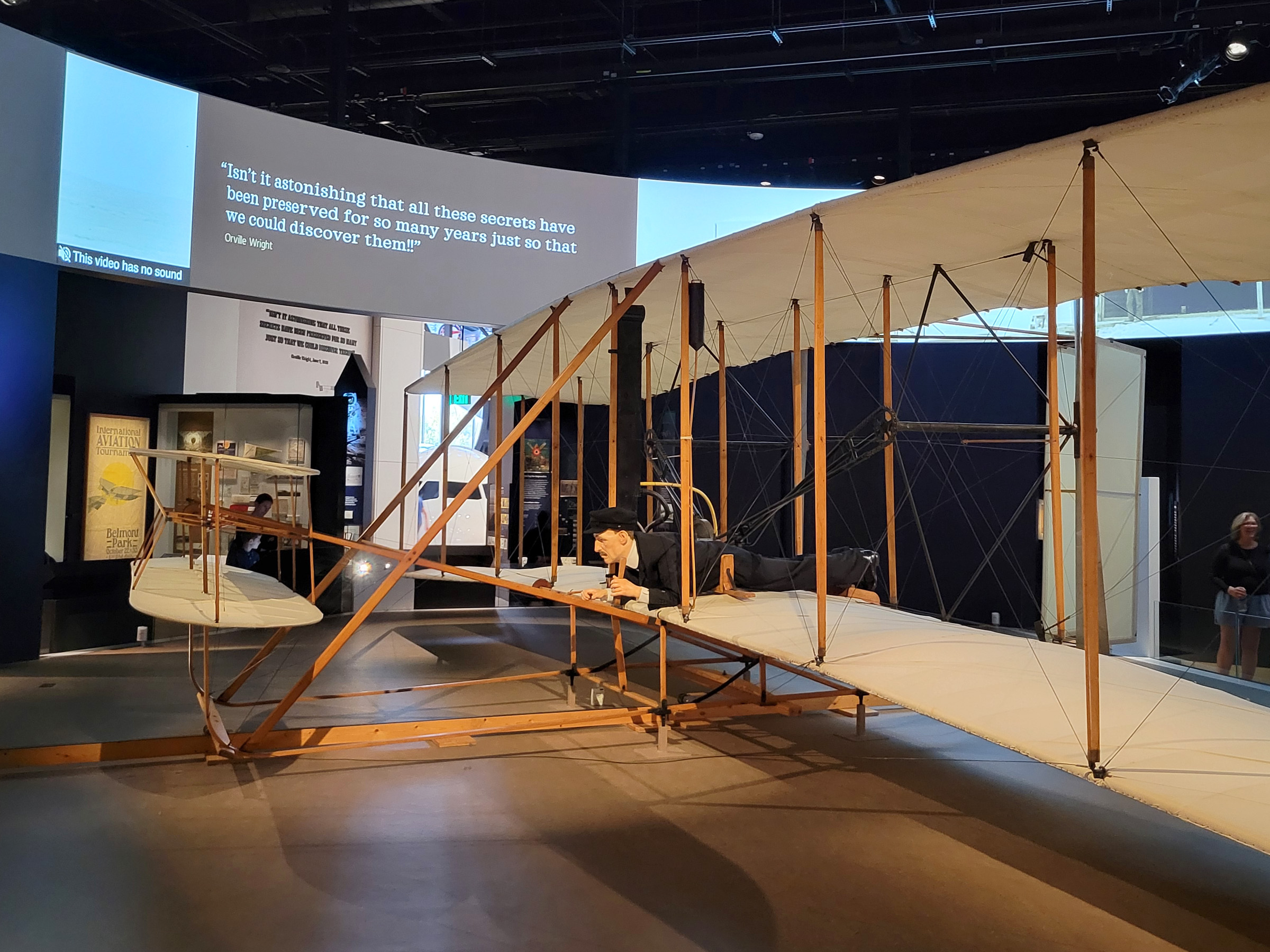저렇게 엎드려서 온몸으로 조종했던 이 비행기가 실제 날아 올랐던 장소를, 우리 부부가 9월초에 방문했던 여행기는 여기를 클릭해서 보실 수 있다. 비행기 개발과정과 원리에 대한 설명은 여기 국립박물관의 전시가 그 기념공원의 비지터센터보다 훨씬 상세했던 것 같다.