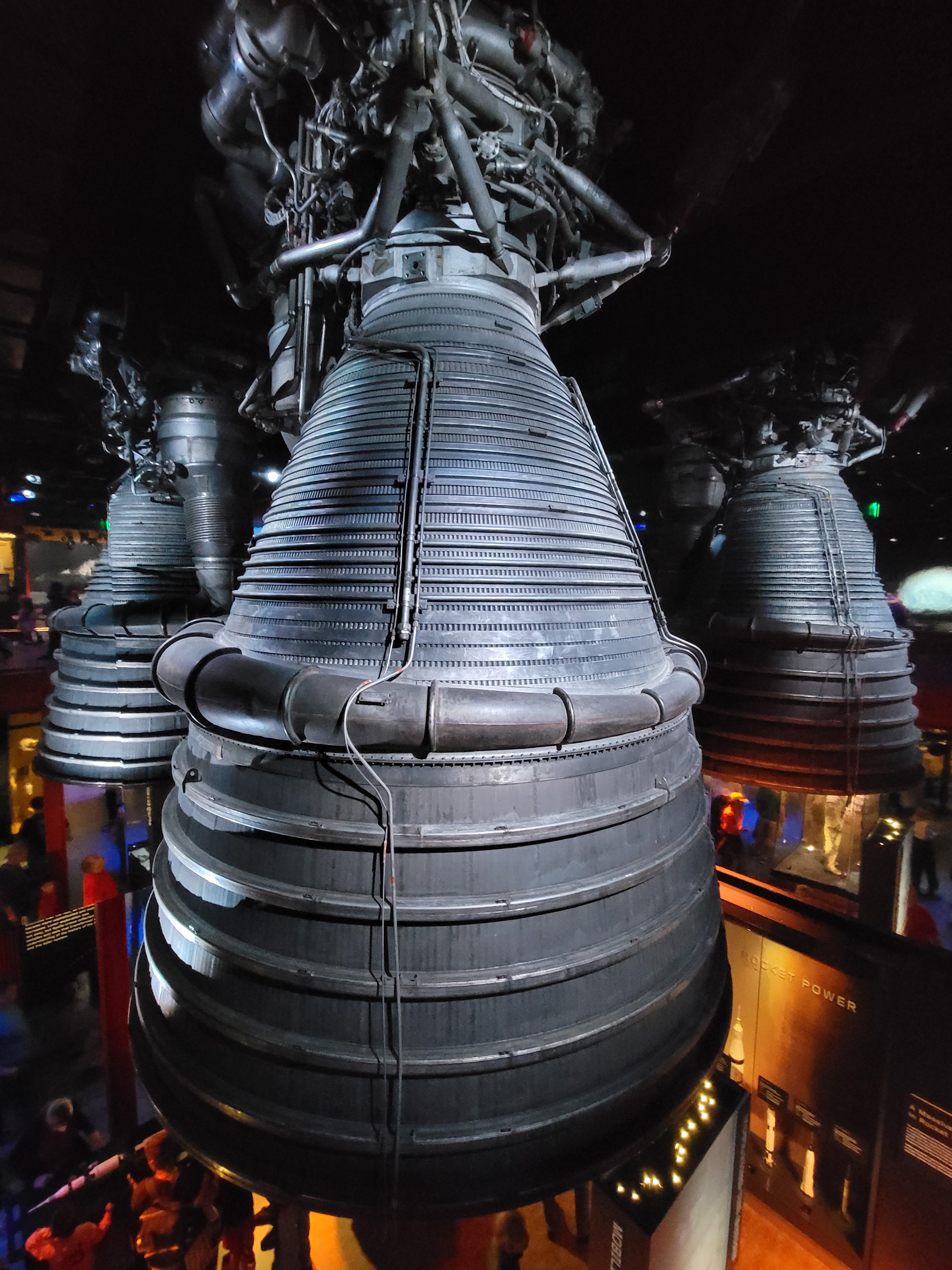 이 전시실은 복층으로 만들어져 있어서 윗층으로 올라갔는데, 최초로 인간을 달까지 보내는데 사용되었던 새턴V 로켓의 엔진이 거울을 이용해서 5개처럼 보이도록 수직으로 전시되어 있다. (2011년에는 수평 전시였음) 우리 가족은 2013년의 플로리다 여행에서 케네디 우주센터에 전시된 거대한 새턴V 로켓의 실물을 봤었는데, 여기를 클릭하시면 그 감동의 여행기를 보실 수 있다.