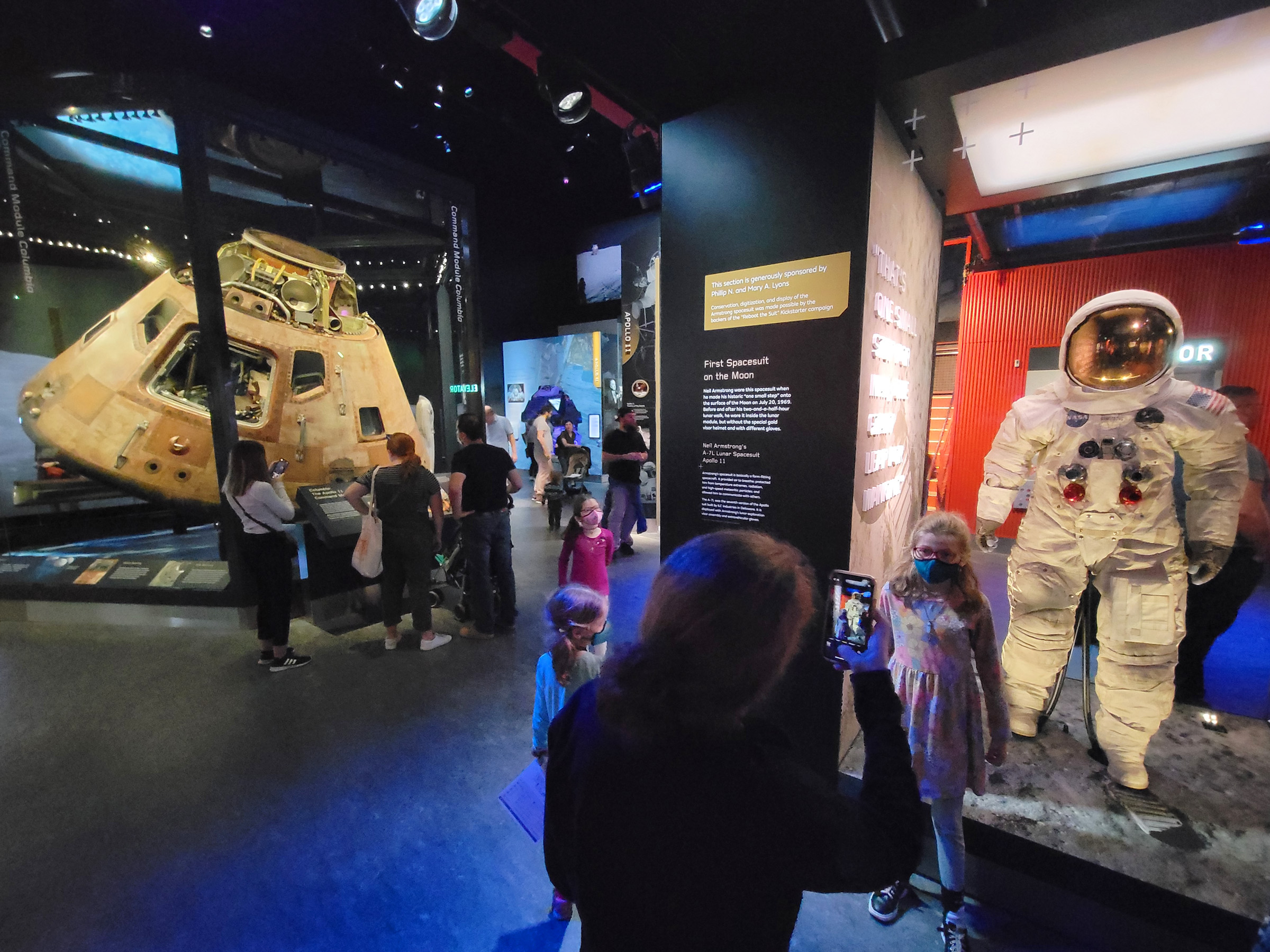 50년도 훨씬 지난 아폴로 계획의 역사를 한자리에 보여주는 206호 <Destination Moon> 전시실에는, 닐 암스트롱이 달에 발자국을 남길 때 입었던 우주복과 지구귀환에 탑승했던 사령선의 실물이 특수보관함에 들어가 있다.