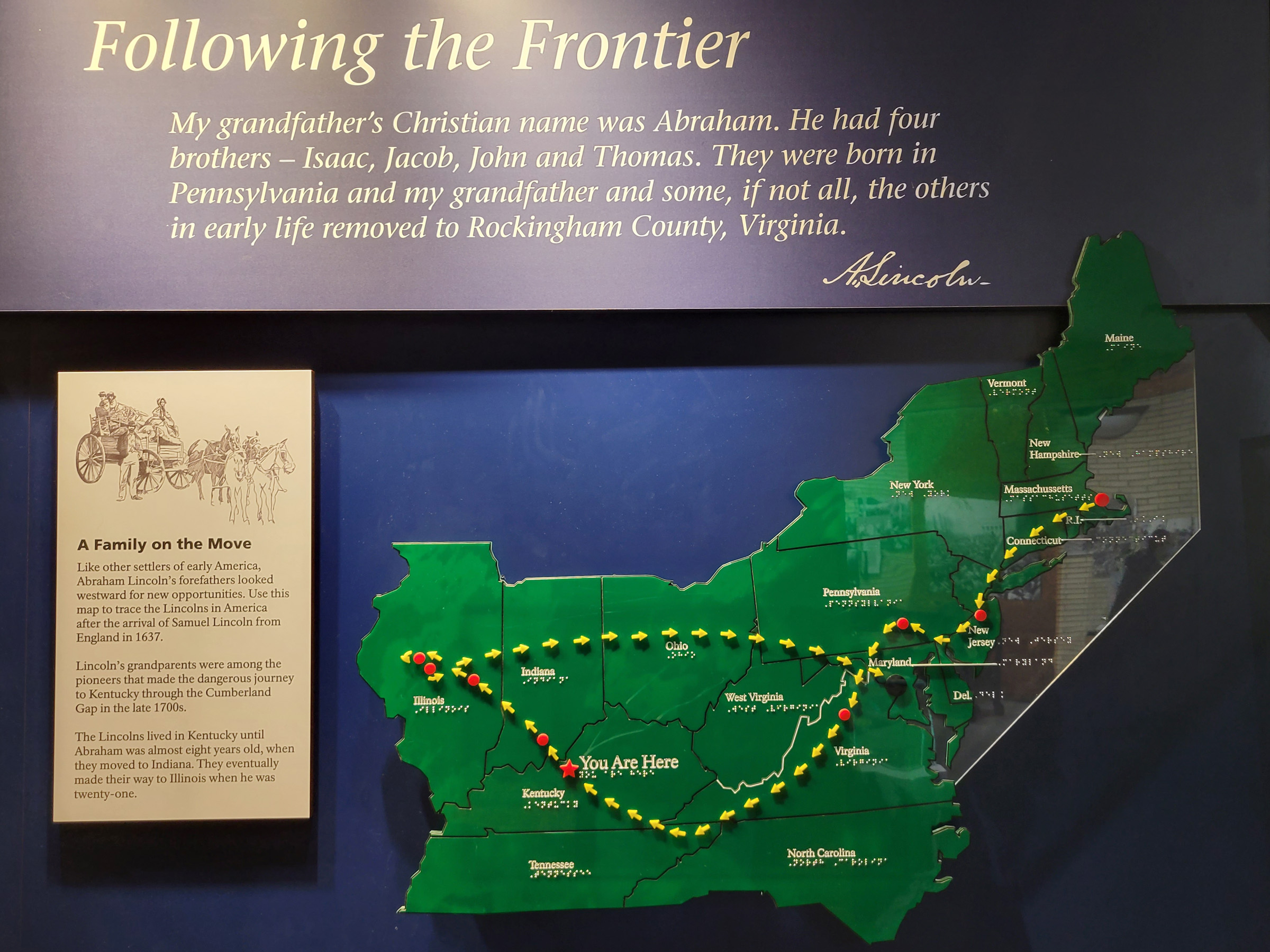 링컨의 할아버지가 가족들을 이끌고 버지니아에서 켄터키로 이주를 했는데, 그는 인디언의 습격으로 사망했다고 한다. 그럼에도 불구하고 아들 토머스는 당시로는 가장 변방인 땅에서 목수일을 배우면서 개척자(Frontier) 가족을 꾸렸다. (참고로 빨간 점으로 표시된 링컨이 소년시절을 보낸 인디애나와, 사회생활을 시작한 일리노이에도 NPS가 관리하는 국립공원이 각각 있어서, 이 곳과 DC의 포드극장 및 기념관까지 총 5곳이 관리되고 있음)