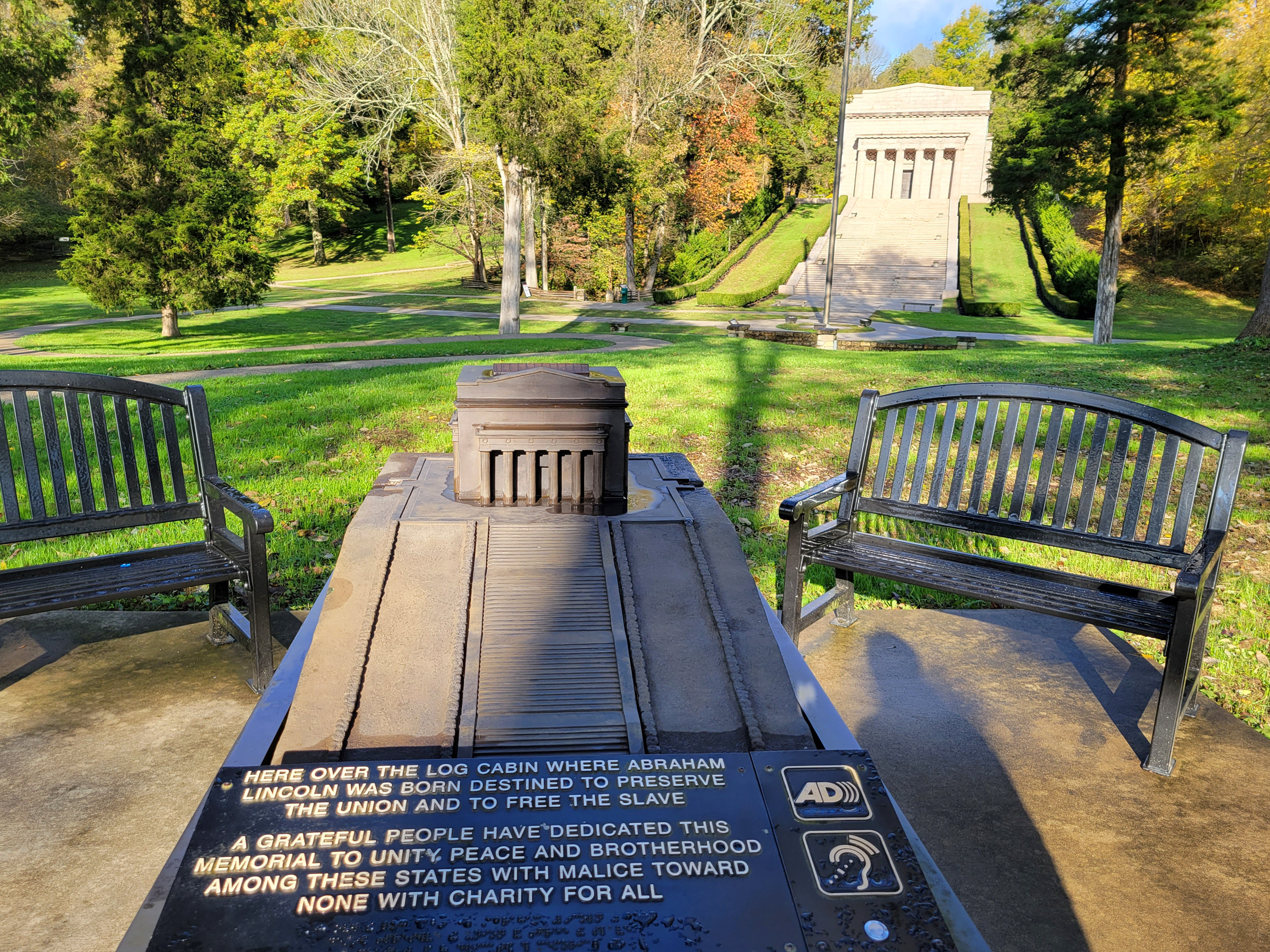 링컨의 아버지 토머스(Thomas)와 어머니 낸시(Nancy)는 1806년에 결혼을 해서 첫 딸을 낳고, 1808년에 200달러에 여기 농장을 매입해서 사진과 비슷한 작은 통나무집을 짓고 살면서 둘째 링컨을 낳았다고 한다. 대강 이 정도 둘러보고 전시관의 옆문으로 나가서 조금 걸어가면 기념물이 보이는데...