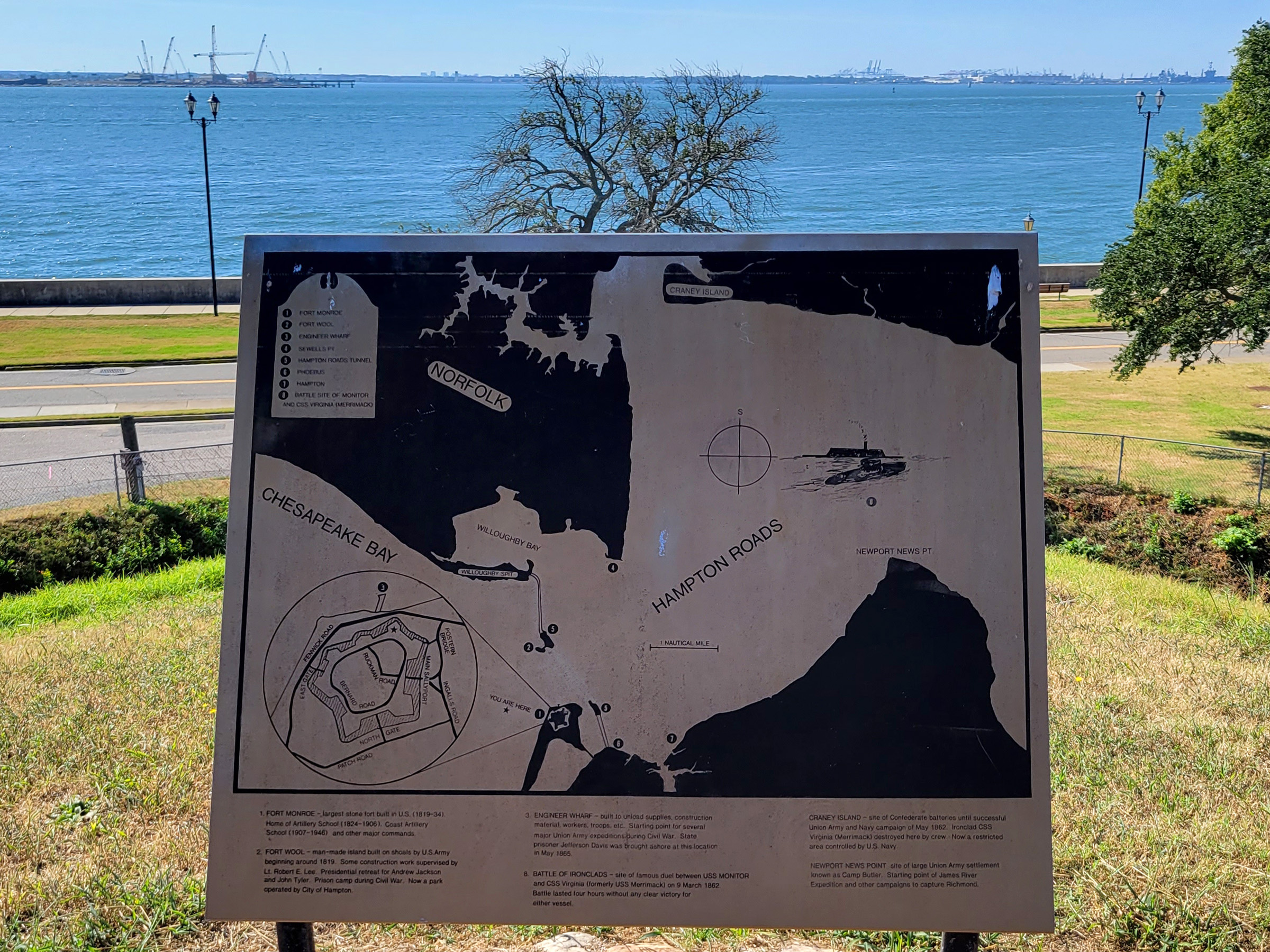 경사로를 따라 성곽 위로 올라오면 앞바다의 지도가 안내판에 그려져 있는데, 남쪽으로 바라보는 것이라서 지도도 위쪽이 남쪽이다. 요새가 있는 곳은 제임스 강(James River)이 체사피크 만(Chesapeake Bay)과 만나는 입구로, 여기서 강을 거슬러 올라가는 물길은 햄프턴로드(Hampton Roads)라 불리며 식민지 시절부터 중요한 항해로였다. 안내판에 미국의 해군기지로 유명한 노퍽(Norfolk)이라는 지명도 보이는데, 그래서 아래 구글지도를 따로 준비했다.