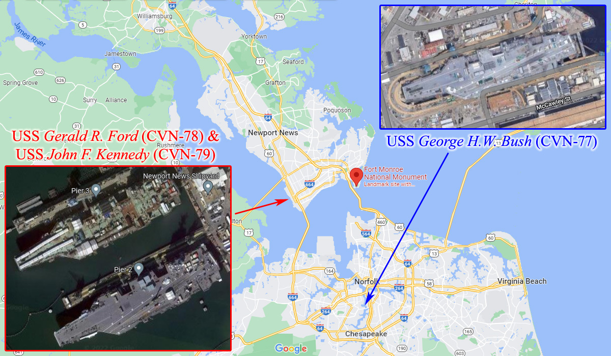 작은 사진들은 모두 올해 초에 찍힌 구글어스 위성사진으로, CVN 일련번호로 알 수 있듯이 가장 최신의 미국 항공모함 3척이 여기 모여있다. 마지막 10번째 니미츠급 항공모함인 오른쪽 USS George H.W. Bush는 노퍽 해군기지에서 보수중에 있고, 올해부터 작전에 투입된 차세대 포드급(Ford class) 항공모함인 왼쪽 아래 USS Gerald R. Ford와, 그 위에 제작중인 같은 급의 USS John F. Kennedy의 두 척은 뉴포트뉴스(Newport News)의 해군 조선소에 나란히 정박해 있다. 이것만 봐도 빨간 마커로 표시된 Fort Monroe가 지키고 있는 입구가 식민지 시절부터 지금 21세기까지 미국에서 얼마나 중요한 요충지인지를 잘 설명해준다.