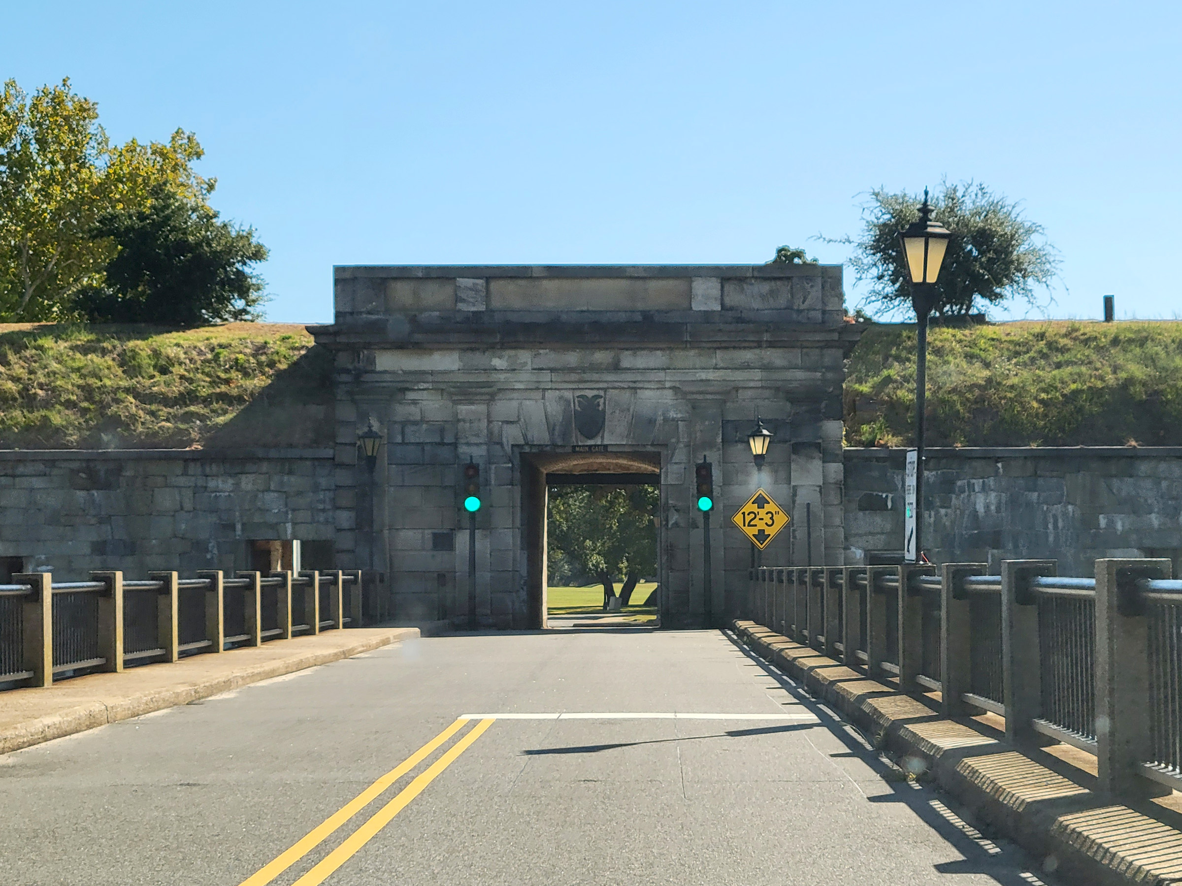 바닷가 모래톱에 인공적으로 땅을 파서 만든 해자(垓子, moat)로 둘러싸인 기하학적인 성벽의 모습이 한 눈에 보인다! 이 요새는 미영전쟁 이후인 1819년에 공사가 시작되어 1834년에야 완공되었고, 제5대 대통령인 제임스 먼로(James Monroe)의 이름을 따 명명되었다. 우리가 들어간 정문이 요새의 왼편에 보이는 해자를 건너는 가장 긴 다리인데, 이렇게 당시로는 난공불락의 대단한 요새를 여기에 만든 이유는 나중에 지도로 설명을 드릴 예정이다.