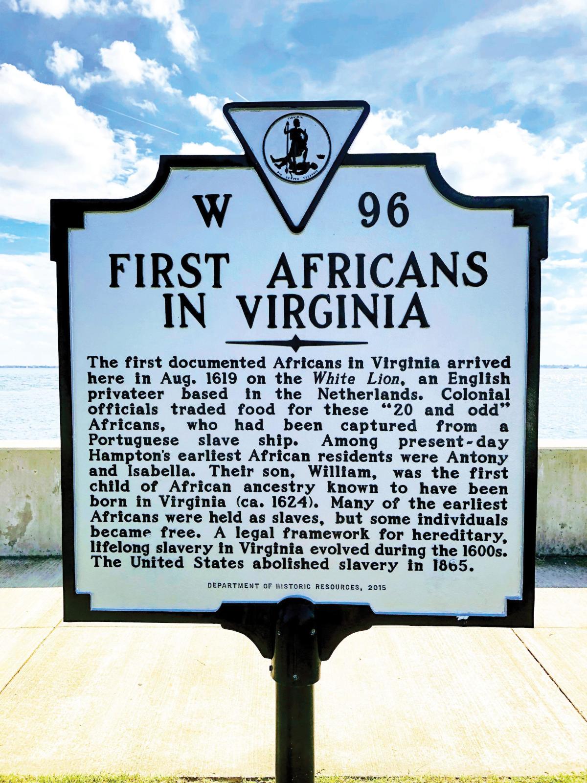 앞서 미국 남북전쟁과 노예해방에 관해 말씀 드렸는데, 사실 그 미국 흑인노예의 역사가 시작된 곳도 이 바닷가라고 한다. 식민지 시절이던 1619년에 영국 사략선(privateer)이 서인도 제도로 가던 포르투갈 노예선에서 뺏은 흑인노예 약 20명을 여기 포인트컴포트(Point Comfort)에서 식량과 교환했다는 기록에 따라서, 그들이 영국의 버지니아 식민지에 최초로 발을 디딘 아프리카 흑인으로 추정된다고 한다.