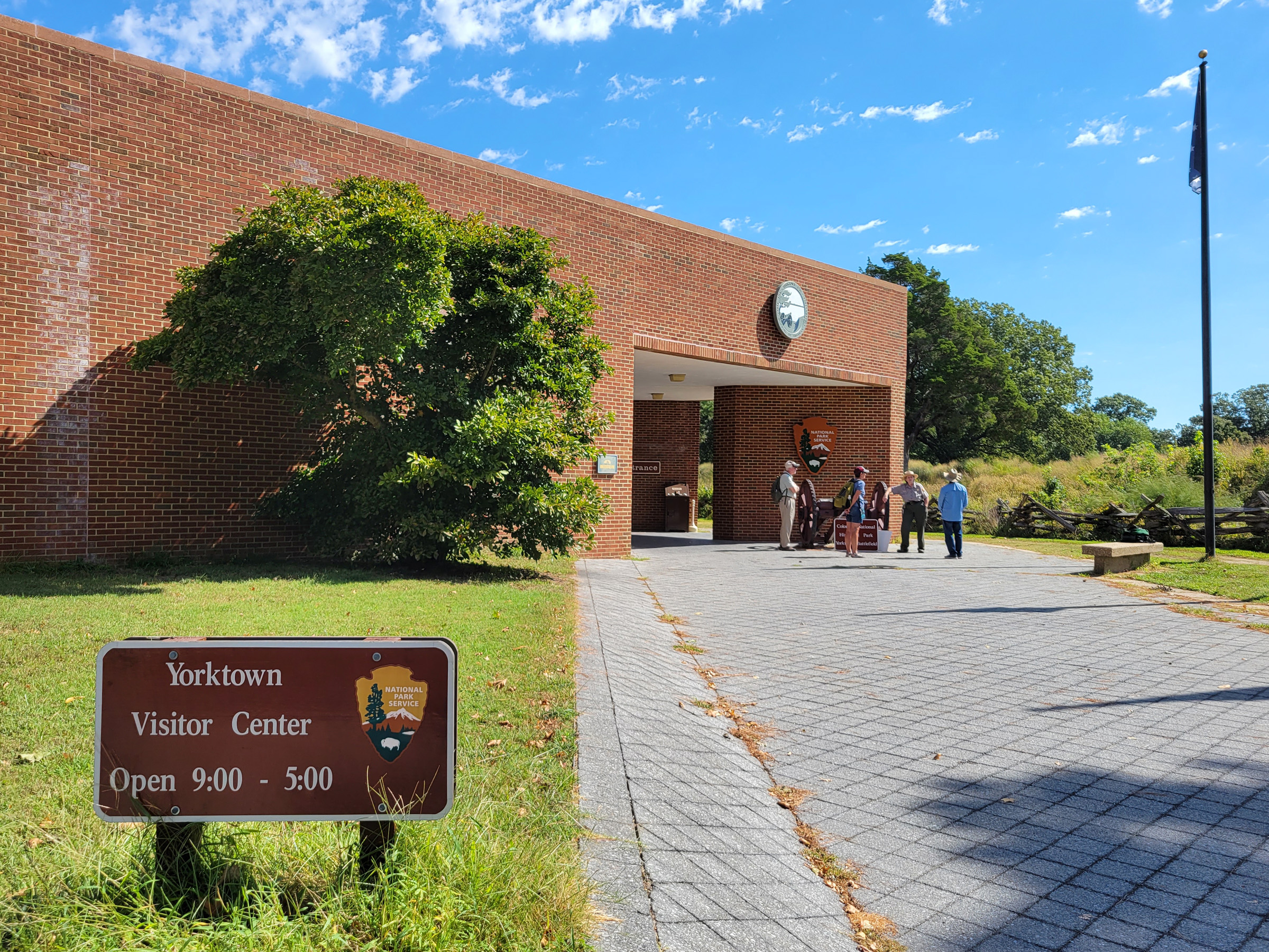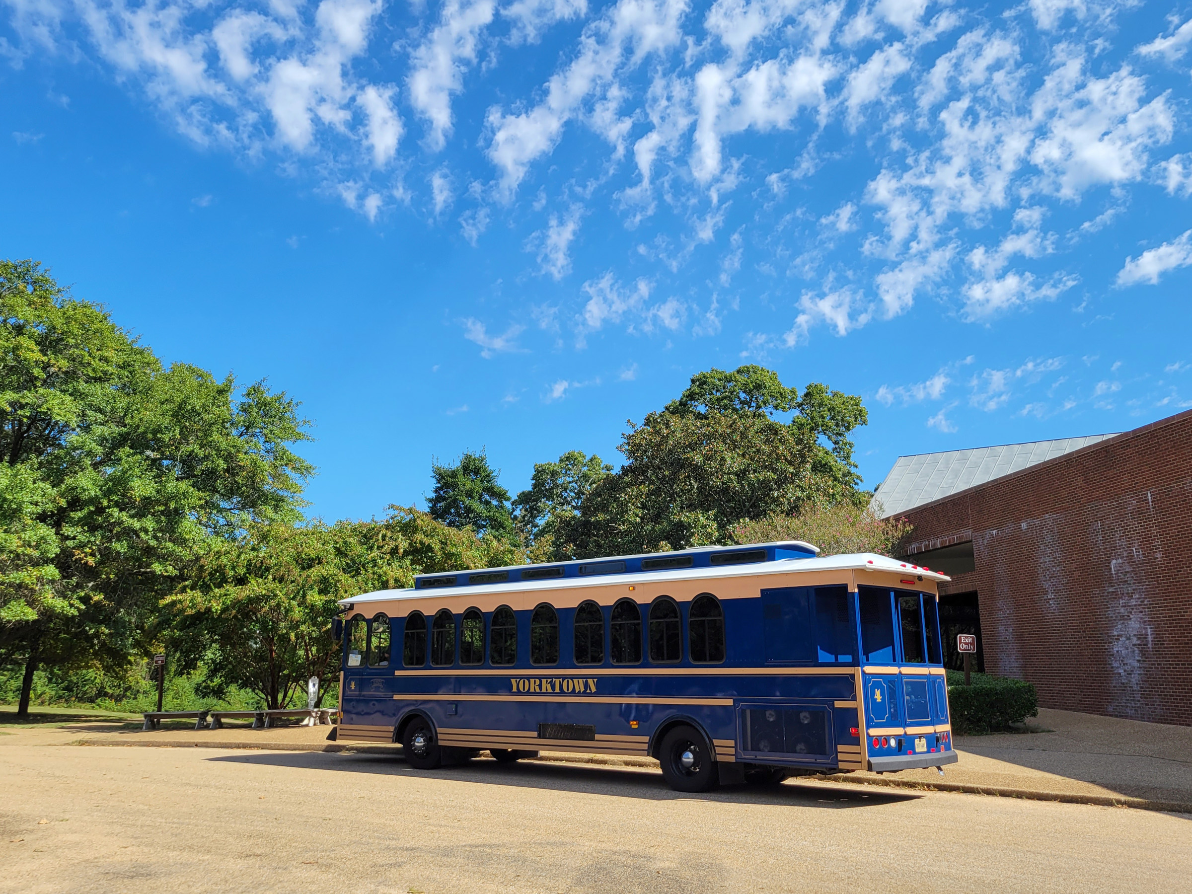 요크타운 배틀필드 비지터센터에 도착을 하니 파란색 트롤리 버스가 사람들을 태우고 있었다. 여기서 가장 중요한 볼거리인 요크타운 승전기념비(Yorktown Victory Monument)는 저 셔틀을 타거나 차를 몰고 시내로 들어가야 볼 수 있는 것을 당시에는 몰랐었다.