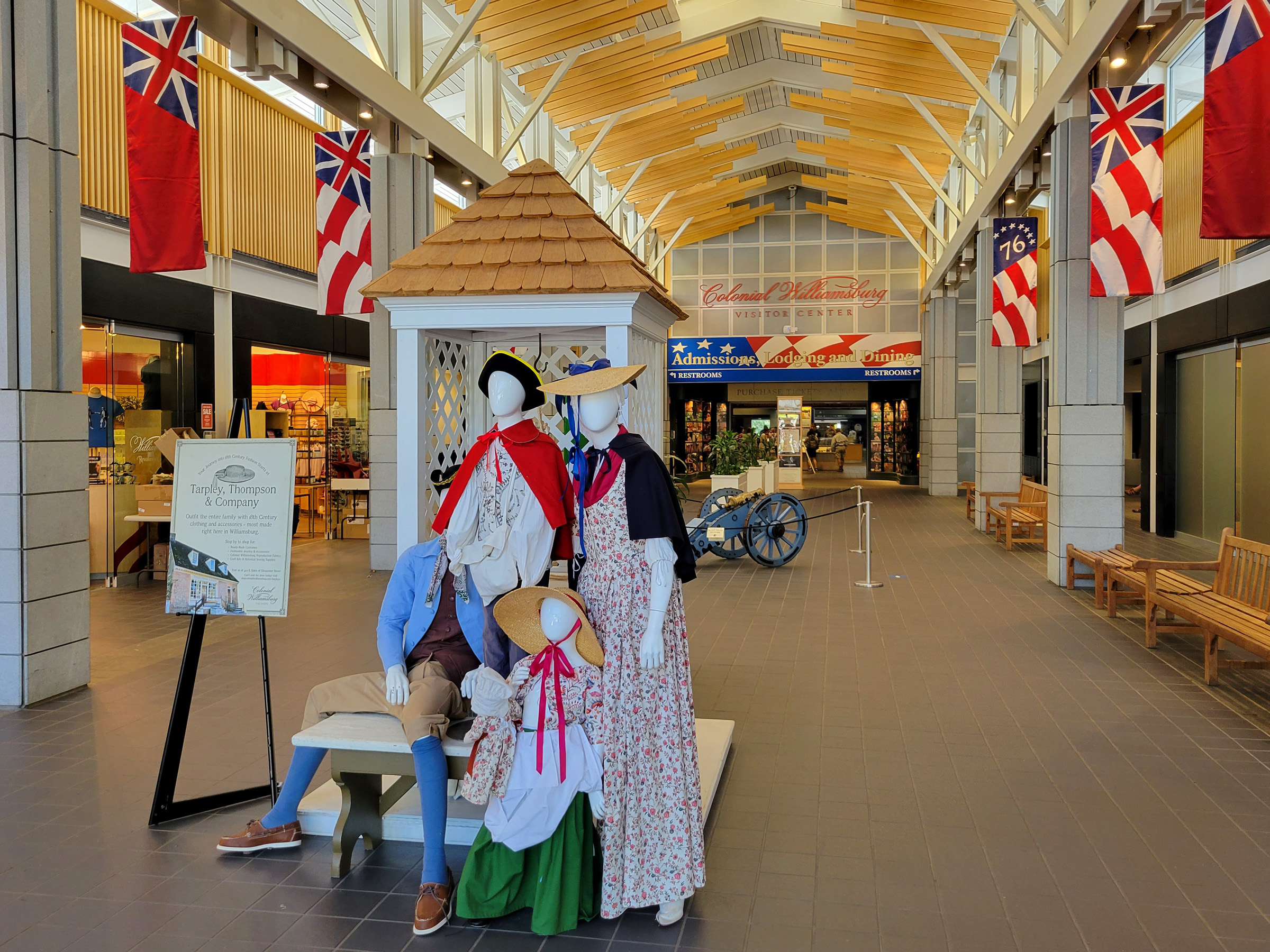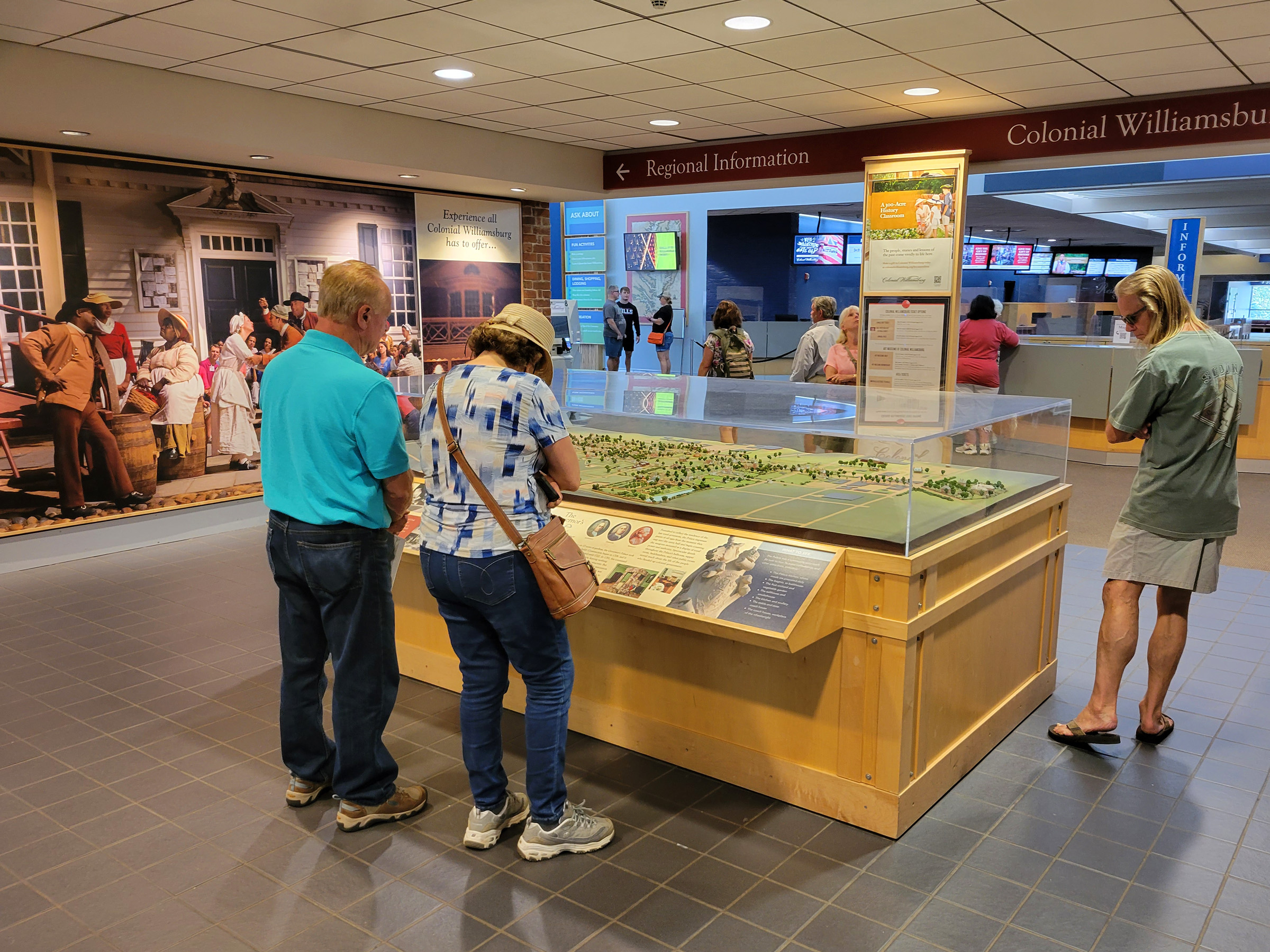 처음 지도에서 약간 붉게 표시된 콜로니얼 윌리엄스버그(Colonial Williamsburg) 모형의 좌우 벽에는 그 '민속촌'에서 일하시는 분들이 식민지 시대의 복장으로 돌아다니는 모습의 큰 사진이 보인다. 여기서 비싼 티켓을 사서 셔틀을 타고 가면 Governor's Palace나 Art Museum에 들어가보고, 간단한 공연 등도 볼 수 있다고 하는데, 티켓 없이 그냥 대학 캠퍼스 부근에 차를 대고 걸어가도 바깥 거리의 풍경은 모두 볼 수가 있다고 한다!