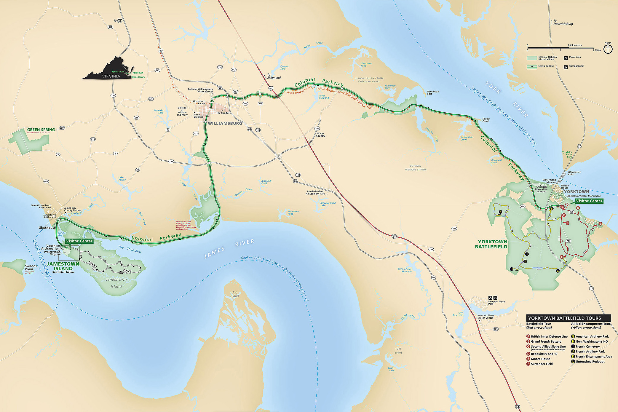 1607년 5월 13일에 대서양을 건너서 신대륙 버지니아 식민지(Colony of Virginia)의 작은 섬에 도착한 영국인들이 그 곳에 처음으로 성공적인 정착촌인 제임스타운(Jamestown)을 만들었다. 그로부터 약 174년 후인 1781년 10월 19일에 거기서 동쪽으로 불과 약 20 km 정도 떨어진 요크타운(Yorktown)에서, 5년전에 독립을 선언한 미국과 이를 돕는 프랑스의 연합군이 식민지배를 이어오던 영국군의 항복을 받아내며 독립혁명의 종지부를 찍는다. 이렇게 미국 역사에서 식민지 시대(Colonial Era)의 시작과 끝을 상징하는 두 장소와 함께, 그 두 곳을 연결하는 옛날 도로를 묶어서 국립공원청이 콜로니얼 국립역사공원(Colonial National Historical Park)으로 관리하고 있다.