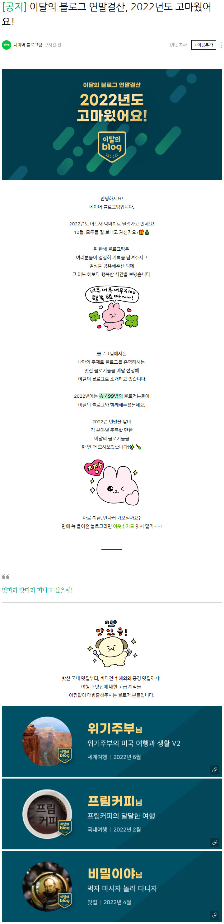 P.S. 지난 6월에 네이버가 뽑는 '이달의 블로그' 세계여행 분야에 선정되었었는데, 오늘 이메일을 확인해보니 연말결산에서 세계여행 분야의 주목할 만한 블로거로 위기주부가 뽑혔습니다! 세계여행 분야는 6월에 10명, 12월에 8명이 소개가 되었으니, 그 예선을 통과한 18명 중에서도 저를 콕 찝어주신 네이버 블로그팀 관계자 여러분께 이 자리를 빌어서 감사의 말씀을 드립니다. 언제 미국 출장이라도 오시면 연락주세요~^^ (여기나 아래를 클릭 또는 터치하시면 블로그팀 공식블로그의 공지 포스팅을 직접 보실 수 있음)