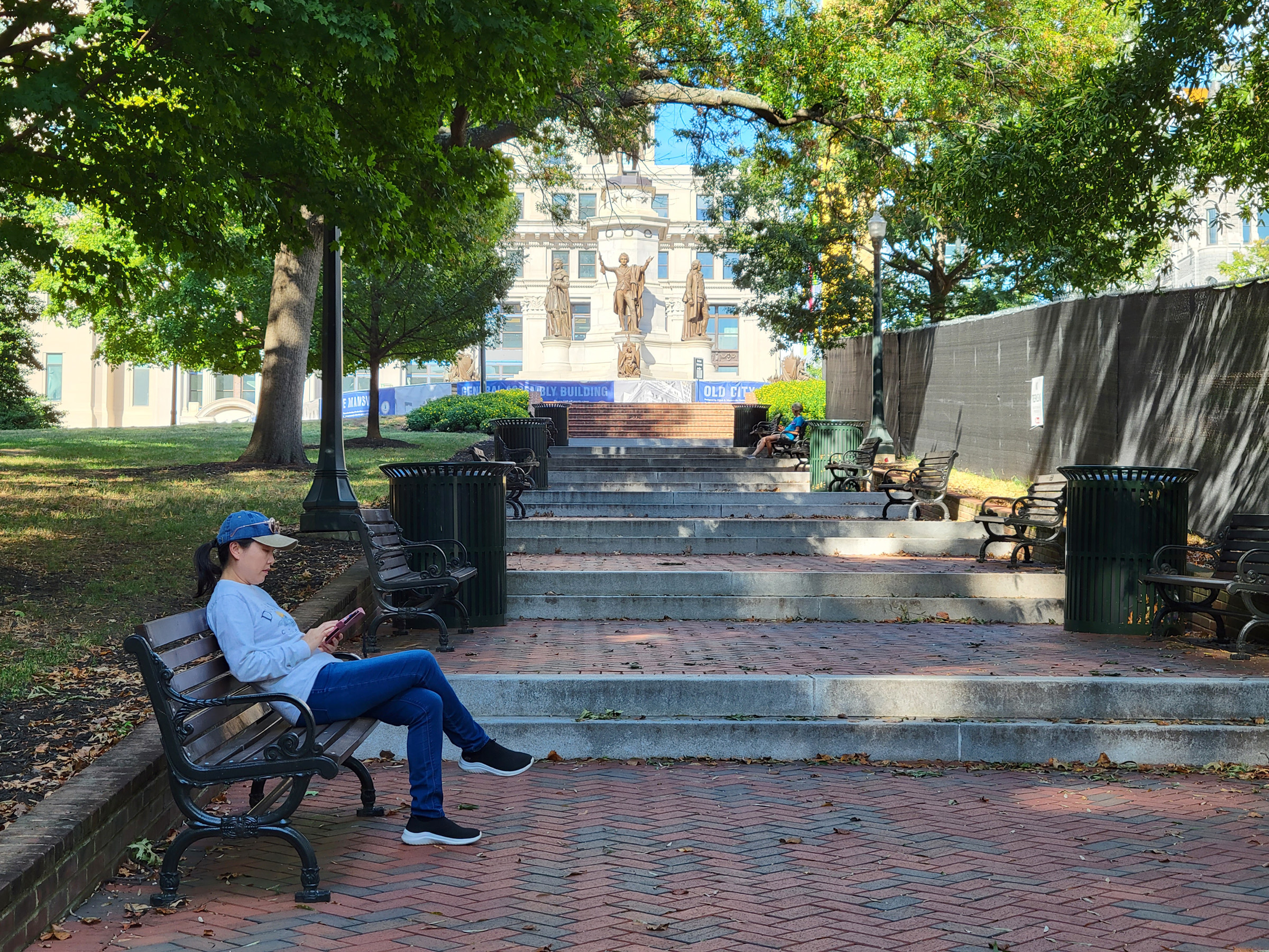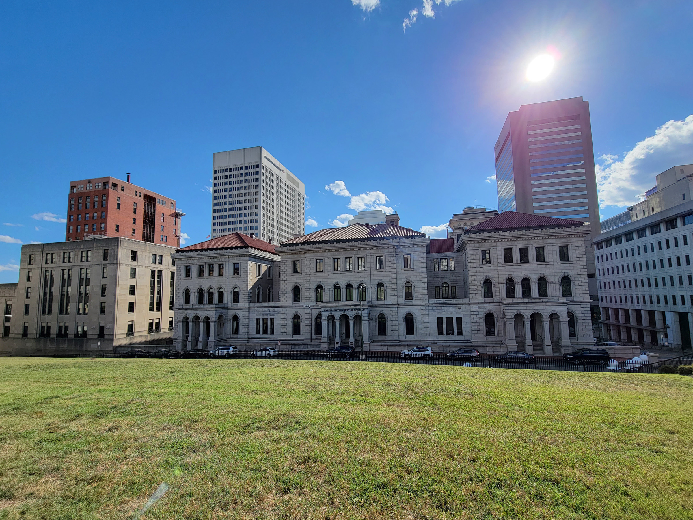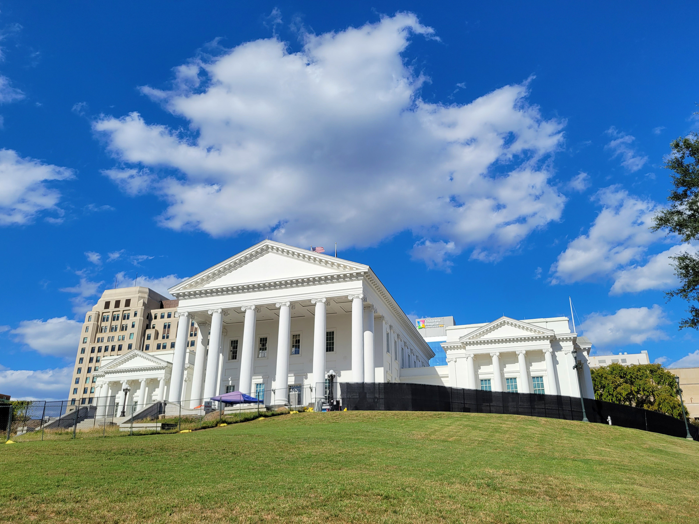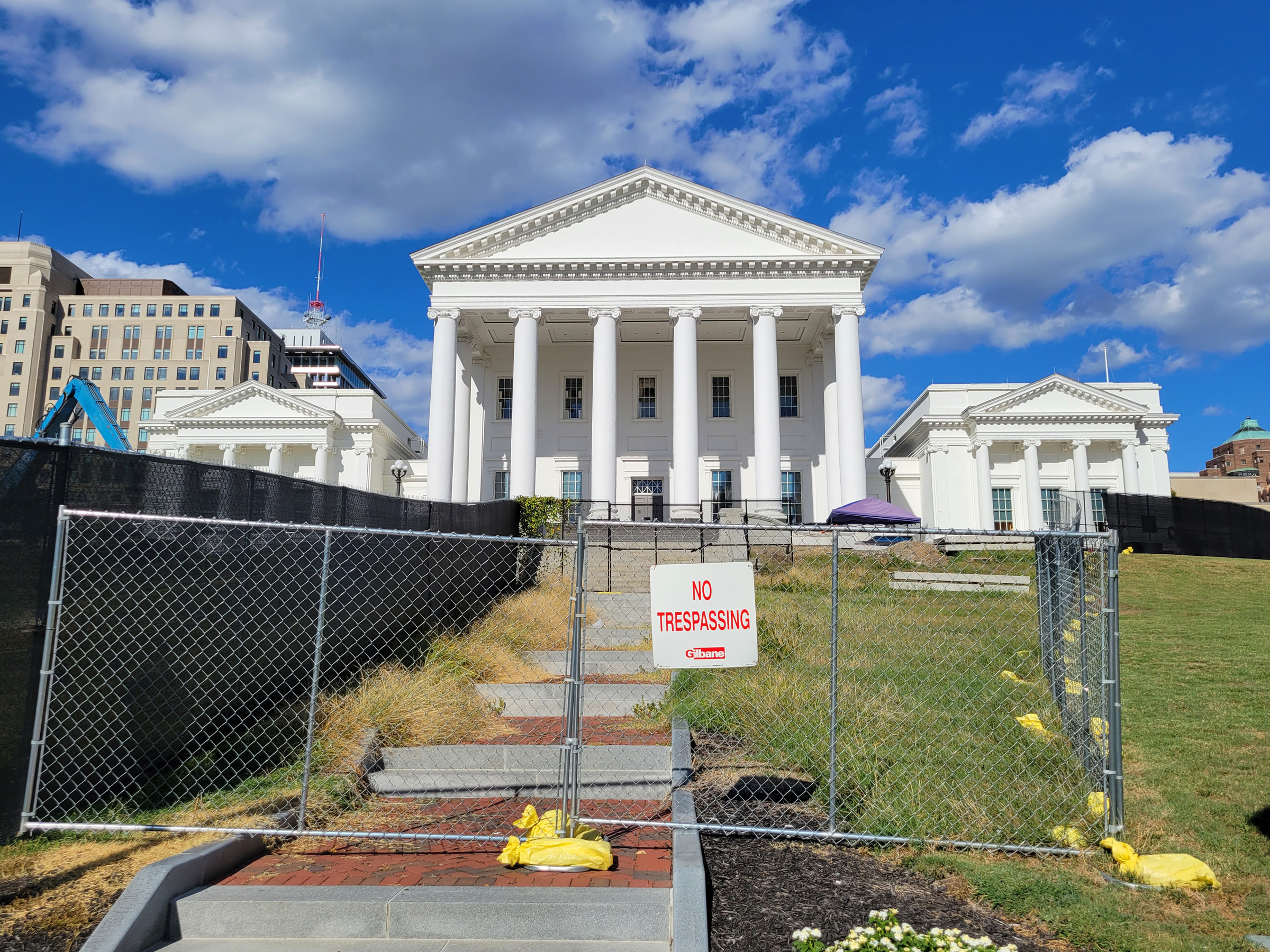 하얀색의 버지니아 주청사(Virginia State Capitol)가 철망과 까만 가림막 너머로 보였다. 제2대 주지사인 토머스 제퍼슨(Thomas Jefferson)이 1780년에 주도(state capital)를 윌리엄스버그에서 리치몬드로 옮기고, 그가 프랑스 대사로 가있는 동안에 직접 설계해서 보내온 도면에 따라 1785년에 공사가 시작된 이 건물은 신대륙에 지어진 최초의 로마 신전(Roman temple) 스타일의 건축물이라고 한다.