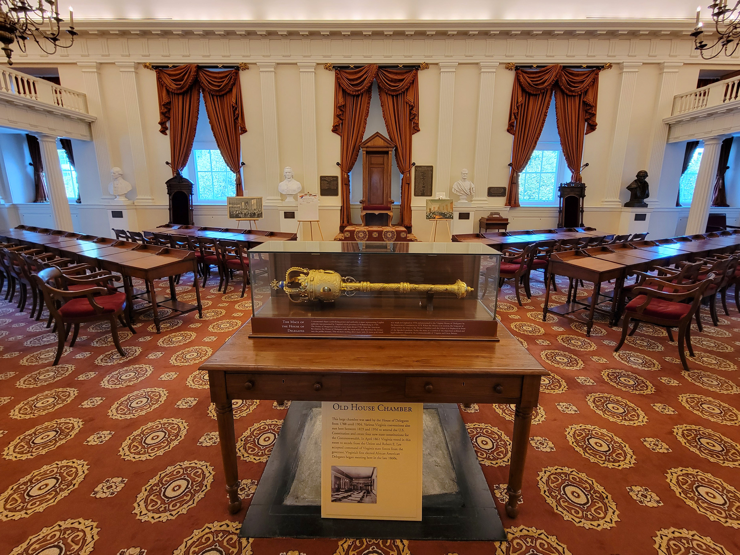 동상 뒤쪽으로 입구가 보이던 Old House Chamber는 1788년부터 1904년까지 사용된 최초의 회의실로, 1861년에 이 방에서 버지니아의 미연방 탈퇴도 결정되었던 역사적인 장소이다. 책상 위에 놓여진 메이스(Mace)는 1930년대 영국에서 만들어 버지니아 주의회에 선물한 것으로, 옛날 식민지 시절부터 이어지는 영국과 버지니아의 정치적 유대를 상징하는 것이라 한다. (실제 1700년대 초부터 영국 국왕이 임명한 식민지 총독의 권위를 상징하는 비슷한 메이스가 전해져 왔는데, 독립혁명 후에 더 이상 의미가 없으니까 그냥 팔아버렸다고 함. 지금 그 물건은 어디 있을까?)